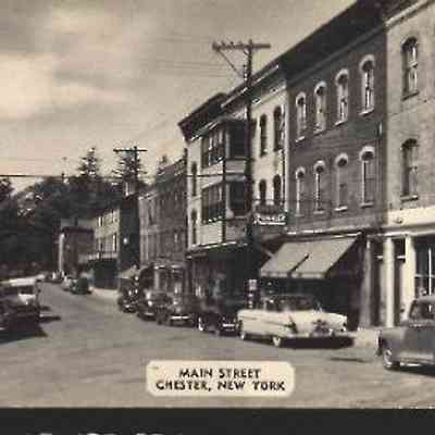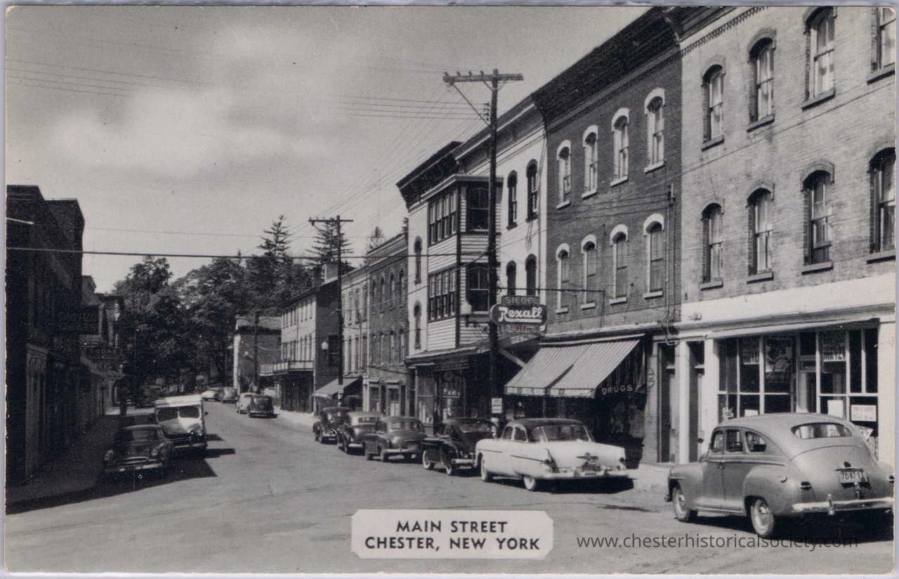 This photo postcard showcases Main Street in downtown Chester, New York, from a row of two and three-story brick commercial buildings lining both sides of the street. Alongside the sidewalk, 1940s-1950s vintage automobiles are parked. Prominent on one of the buildings is a "Rexall" drugstore sign, familiarizing this scene with a time when locally owned businesses were commonplace in small American towns.Subject Place