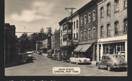 This view shows part of Main Street at Chester, New York. Located in Orange County – in the famous “Greycourt Meadow” or “Black-Dirt Area” – Chester is noted for its famous trotting horse, Hambletonian No. 10, its vegetable farming, dairy farming and as a home center.Transcriber