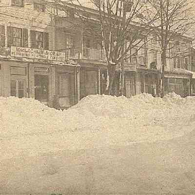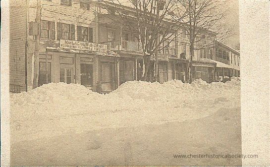 This monochrome photo postcard captures an Uptown Chester scene where a row of two-story buildings of shops, including one with signage reading "MacLachlan & Oram Plumbing & Heating, & Tinsmithing." A massive snowbank lines te street, reflecting the harsh winter conditions typical of the era depicted.Subject Person/Organization