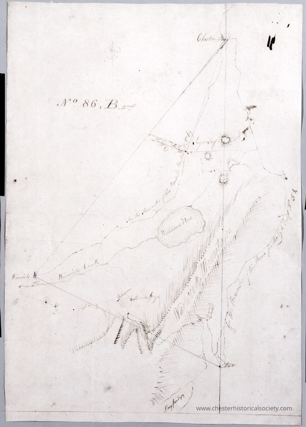 In ink on recto: "No. 86. B2d". Includes texts. To the east, "for the Remarks of the Road see Rough Draft No 5[1]." To the west, "For the Remarks of this Road See Rough Draft No 69." Military topographic map. Covers the townships of Chester and Warwick in Orange County, New York. Shows roads running through East Chester, Sugarloaf, Warwick, Bellvale, Mt. Peter and Dutch Hollow. Also shows buildings and owners’ names, landforms and streams. No title on map recto or verso. Title as given, statement of responsibility, date, series title and series numbering by Erskine, but on separate index sheet filed at head of series. No title proper on map recto or verso. Title as given, statement of responsibility, date, series title and series numbering by Erskine, but on separate index sheet filed at head of series. Pen-and-ink, pencil on laid paper. Shows relief by hachures. Stained and abraded. Mounted on cloth, bound and cropped, disbound and silked by subsequent owners. Cleaned after removal of backings 1999; some fill remains. Sheathed in mylar. Watermark: "GR" beneath shield, similar to Gravell and Miller foreign watermark no. 301. References: Guthorn, Peter J. American maps and map makers of the revolution, p. 17-22; Heusser, Albert H. George Washington’s map maker, p. 249-256.