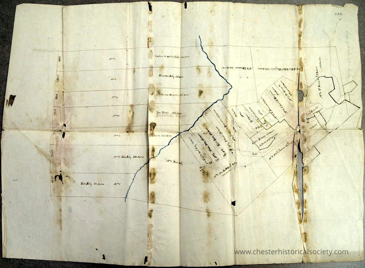 Map showing subdivision of Daniel Crommelin's former holdings within the Wawayanda Patent in central Orange County. These parcels now in the Towns of Blooming Grove and Chester.