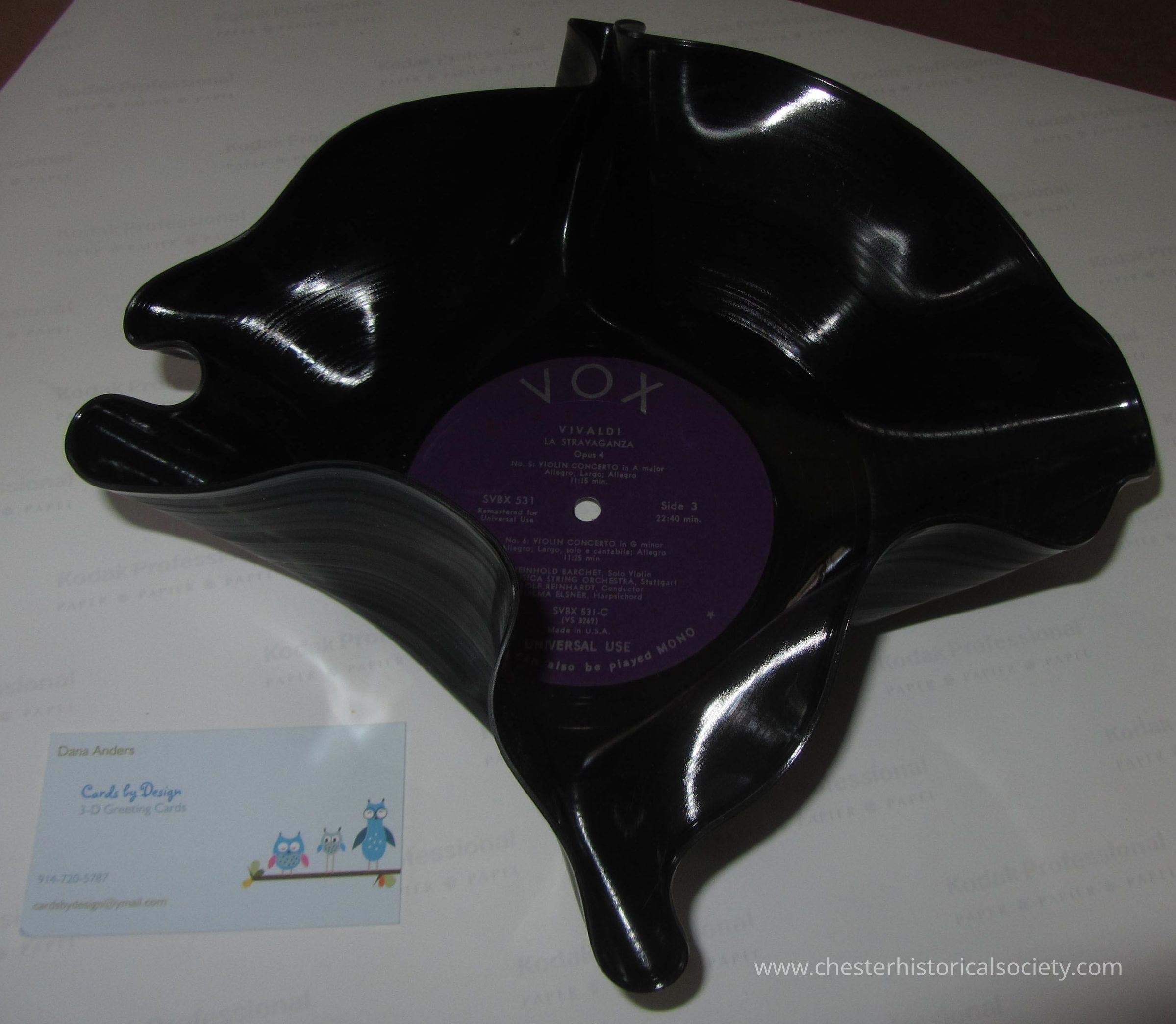 A black vinyl record transformed into a decorative bowl, by Dana Anders, alongside her Cards by Design business card.Category