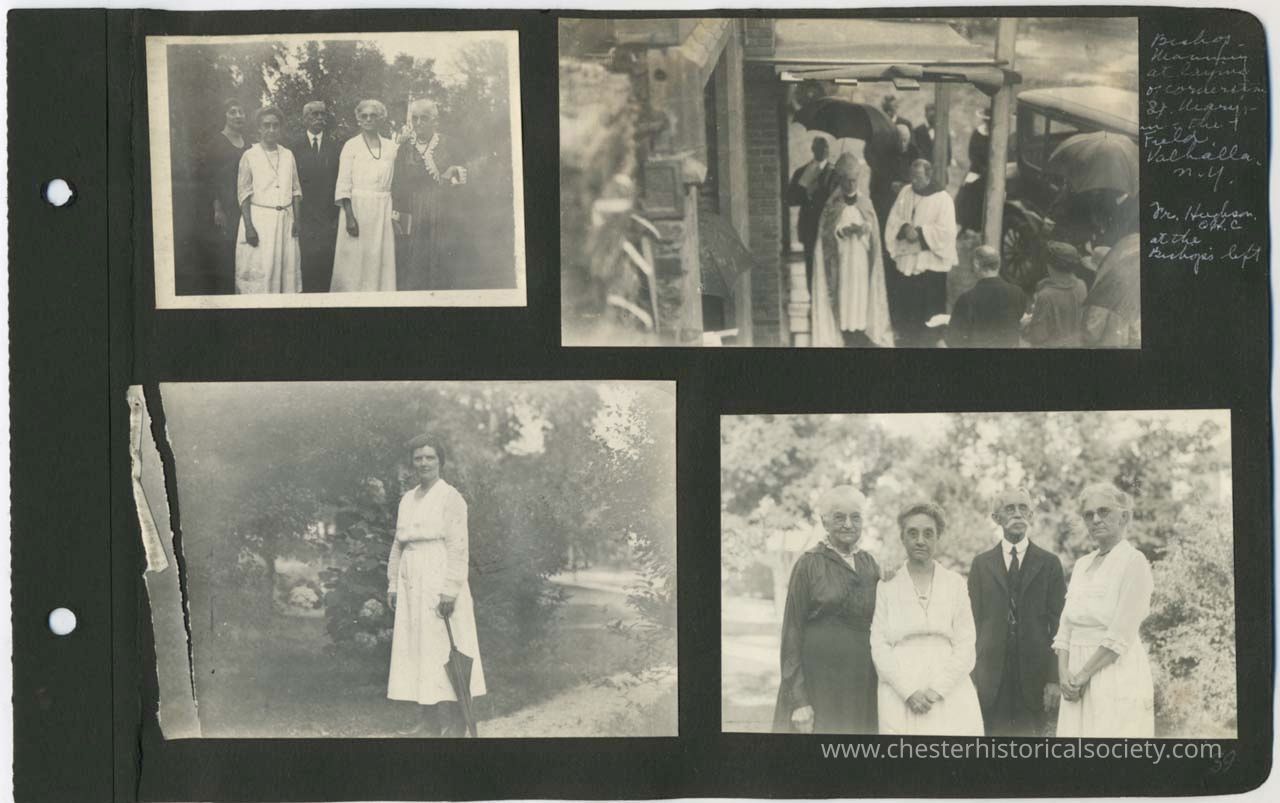39 (two group portraits); (Mildred with umbrella); Bishop Manning at laying of cornerstone St. Mary's in the Field, Valhalla, N. Y., Fr. Hudson O.H.C. at the Bishop's left