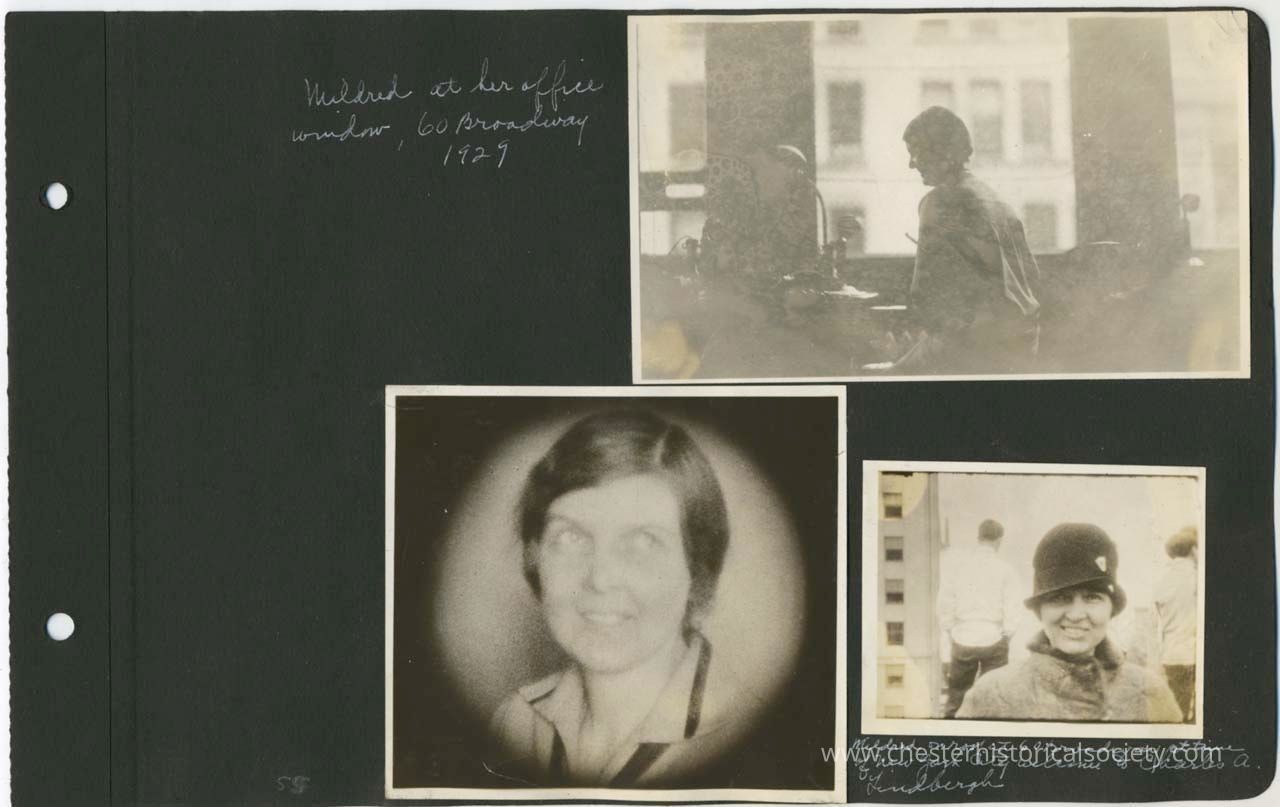 55 Mildred at her office window, 60 Broadway, 1929; (Mildred close-up); Mildred on roof at 60 Broadway at time of New York City welcome to Charles A. Lindbergh