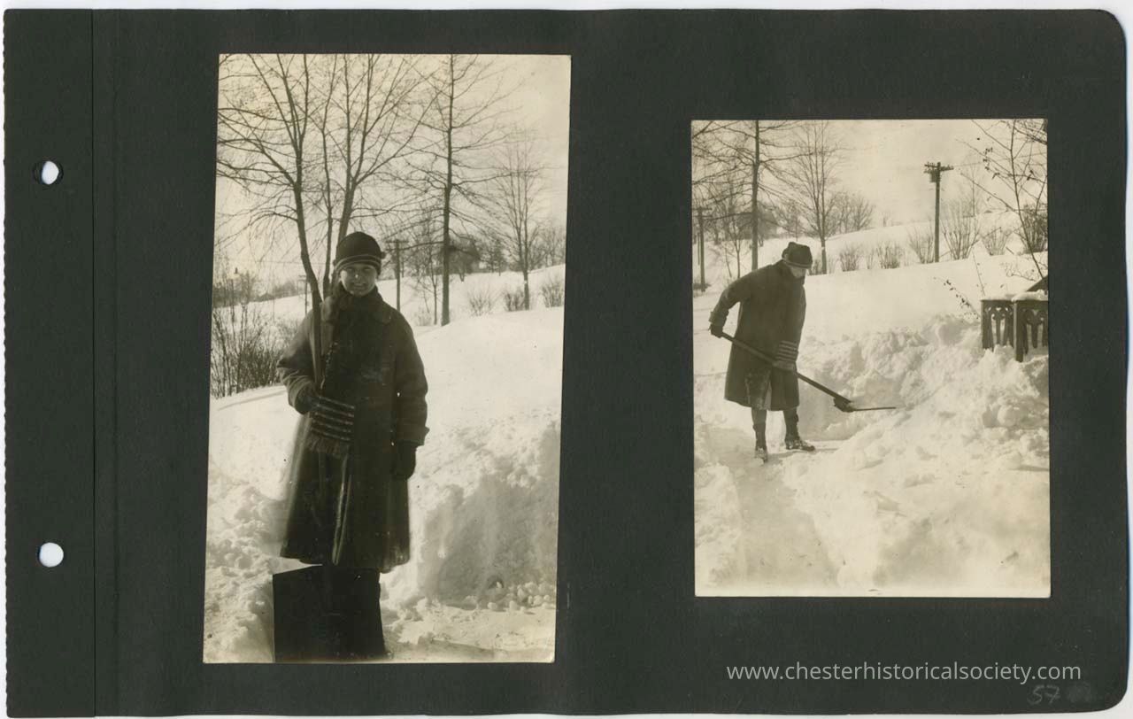 57 (Mildred shoveling snow at their home on Main Street- two photos)