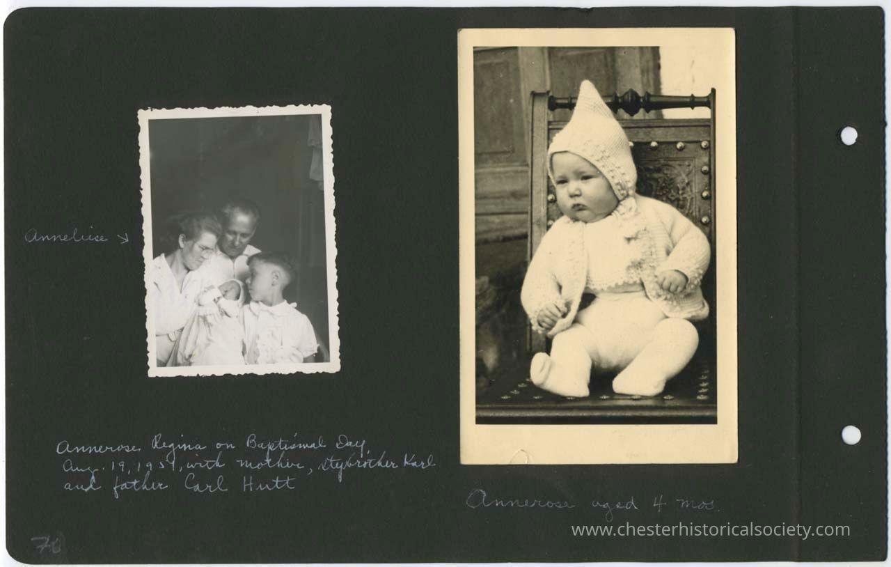 76 Anneliese➘ Annerose Regina on Baptismal Day Aug. 19, 1954, with mother, stepbrother, Karl and father Carl Hutt; Annerose aged 4 mos.