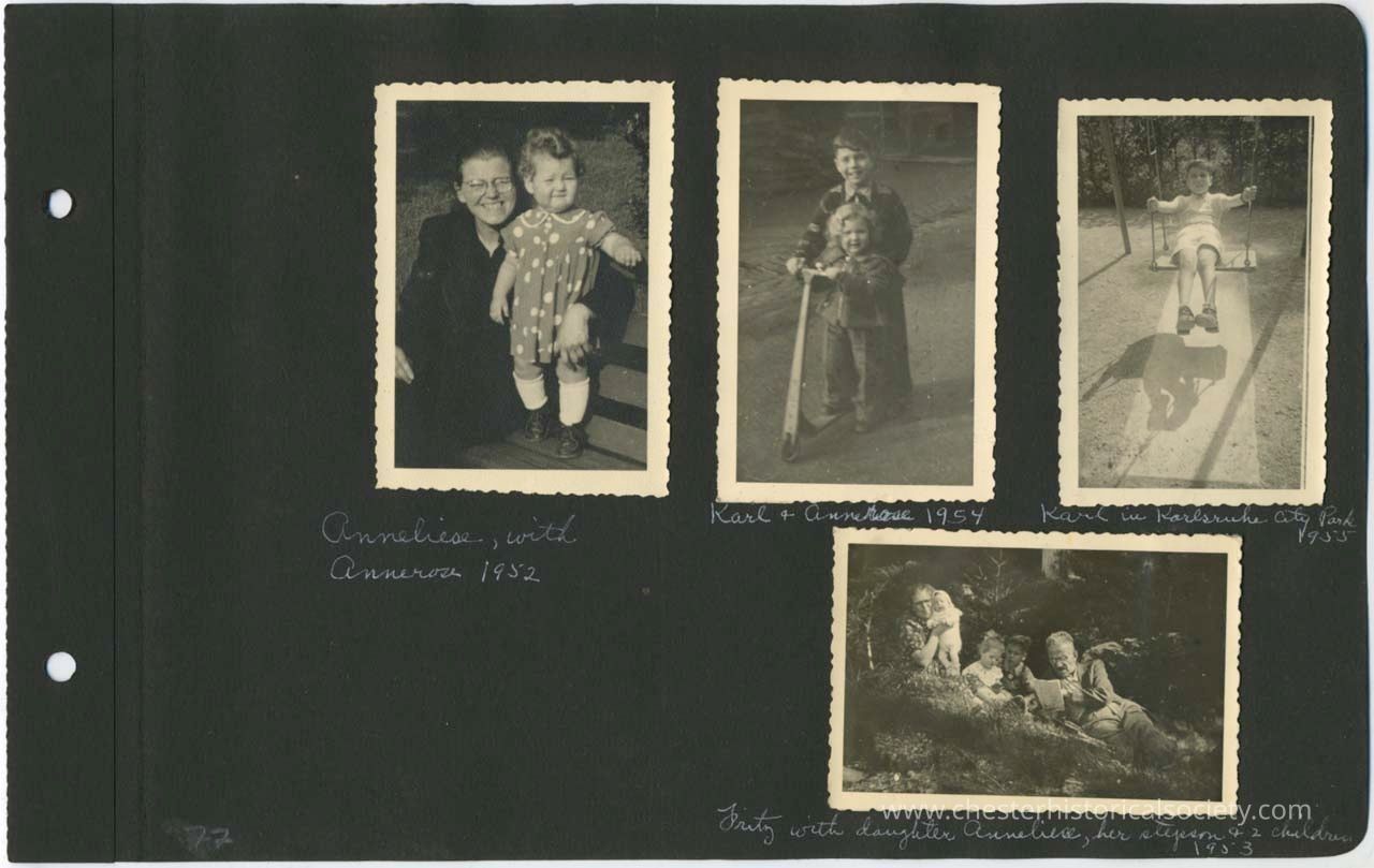 77 Anneliese, with Annerose, 1952; Karl & Annerose 1954; Karl i Karlsruhe Park 1955; Fritz with daughter Anneliese, her stepson & 2 children 1953