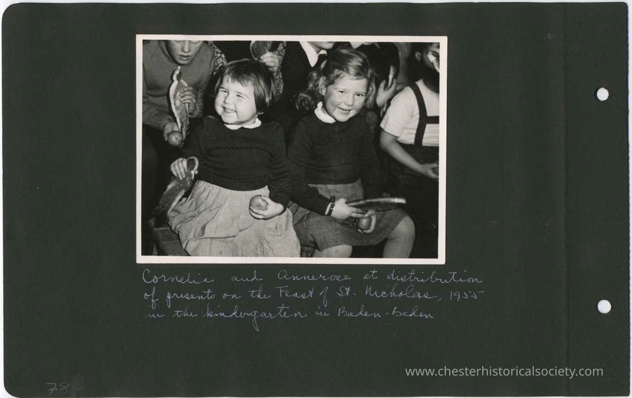 78 Cornelia and Annerose at distribution of present on the Feast of St. Nicholas, 1955 in the kindergarten in Belen-baden