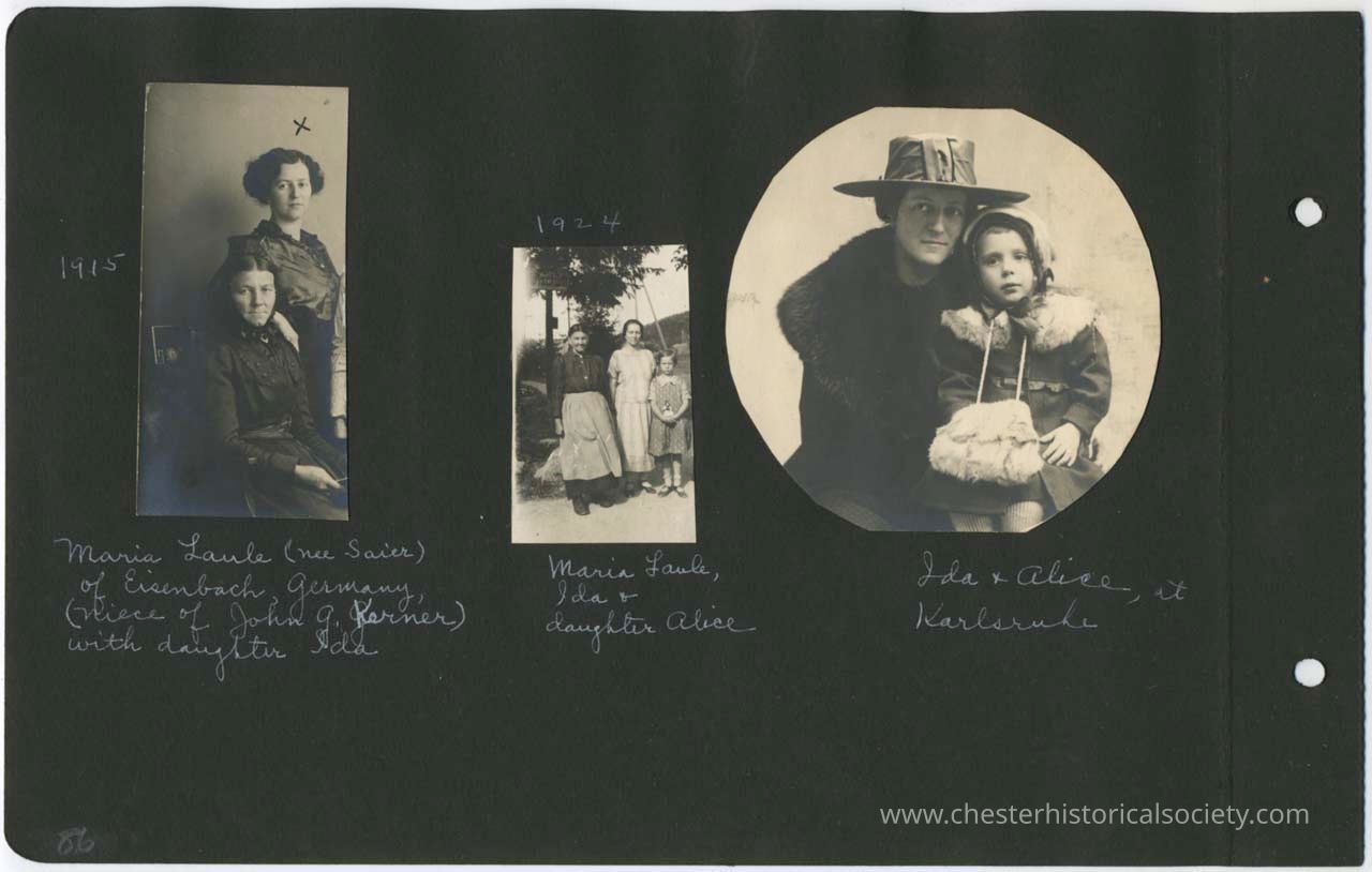 86 1915 Maria Laule (nee Saier) of Eisenbach, Germany, (niece of Joh G. Kerner) with daughter Ida; Maria Laule, Ida & daughter Alice; Ida & Alice at Karlsruhe