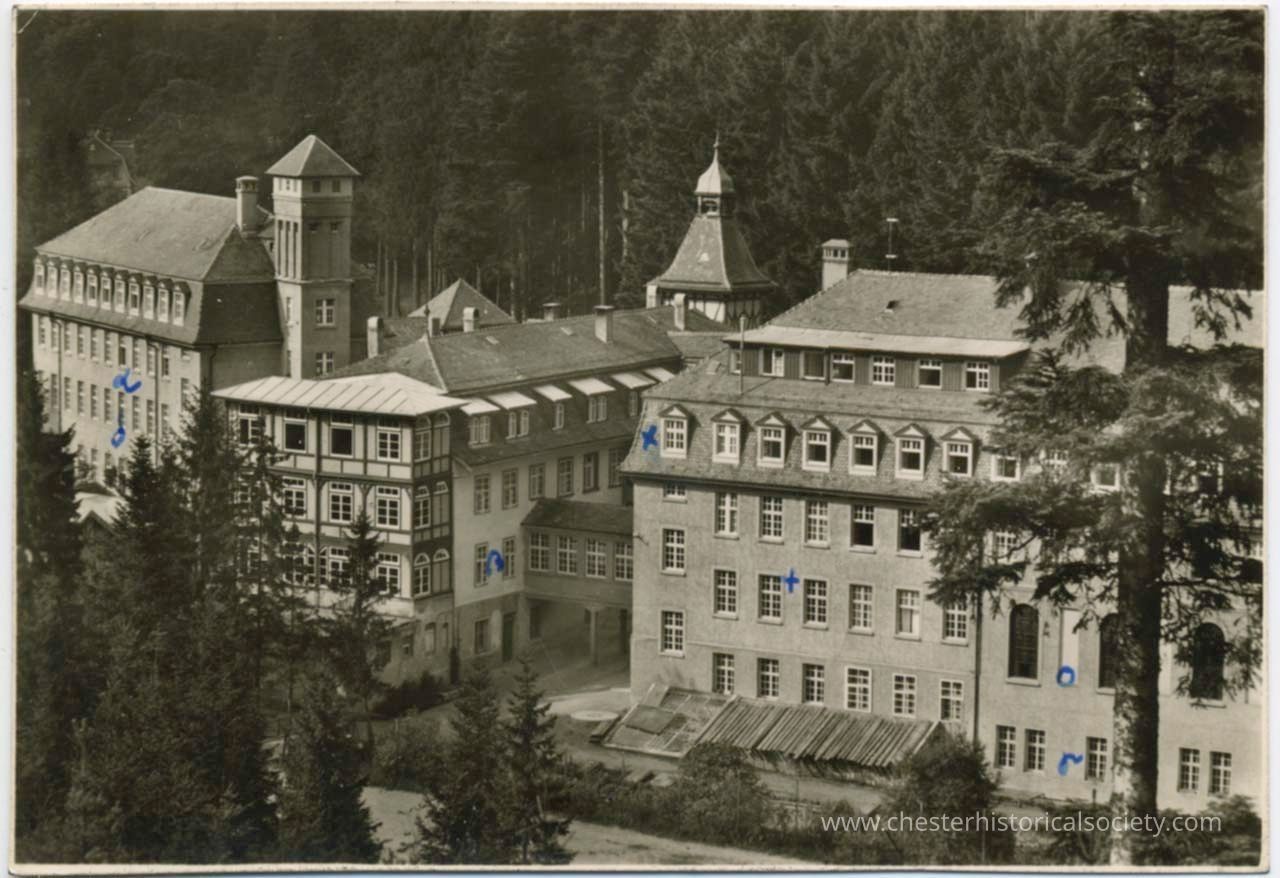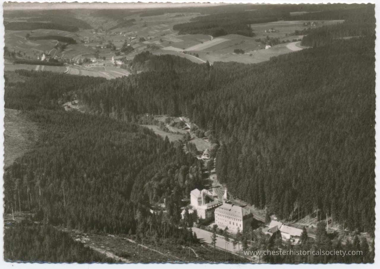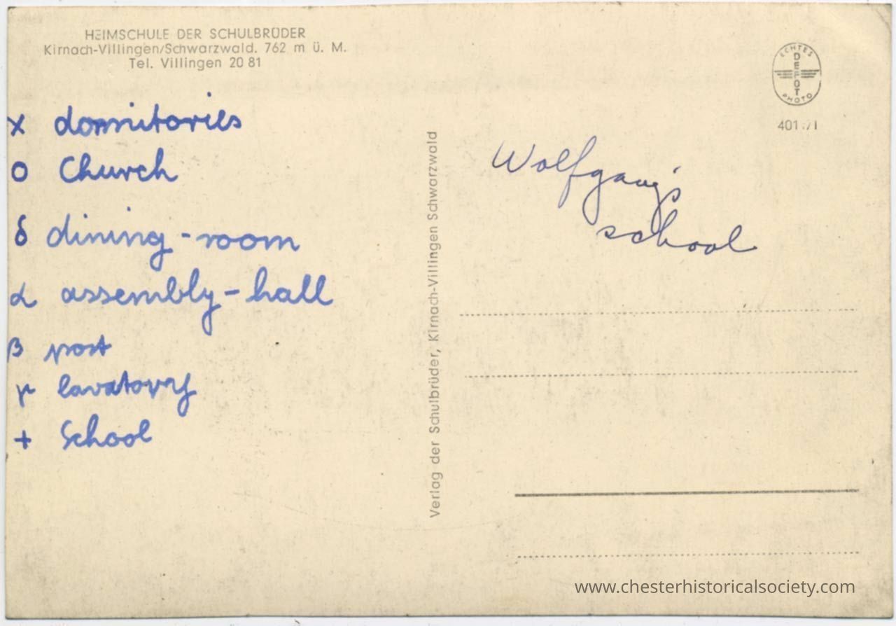 Wolfgang's school (postcard - front & rear) Heimschute deer Schulbrüder Kirnach-Villingen/Schwarzwold, 762 m ü. M. - Tel. Villingen 2081. dormitories, Church, dining-room, assembly-hall, port, lavatory,school
