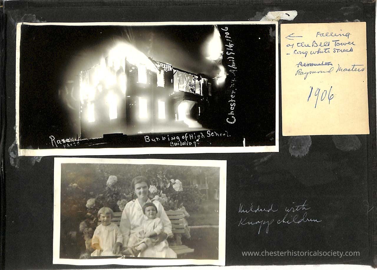 page 50 1. Burning of High School Building Chester , N.Y. April 9th 1906 - Razey Photo (Falling of the Bell Tower - long white streak - note by Raymond Masters 1906)