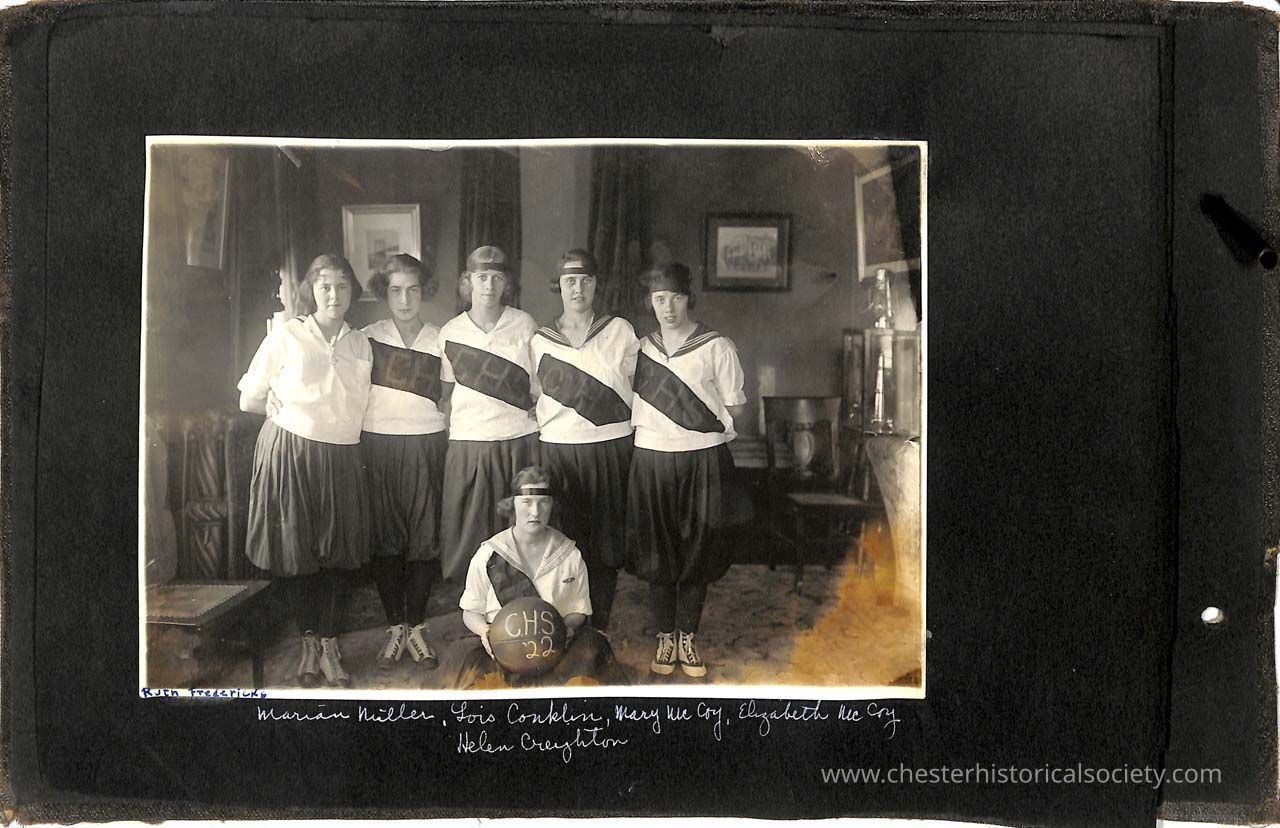 Page 04 1922 Girls Basketball Team: Ruth Fredricks, Marian Miller, Lois Conklin, Mary McCoy, Elizabeth McCoy, Helen Creighton