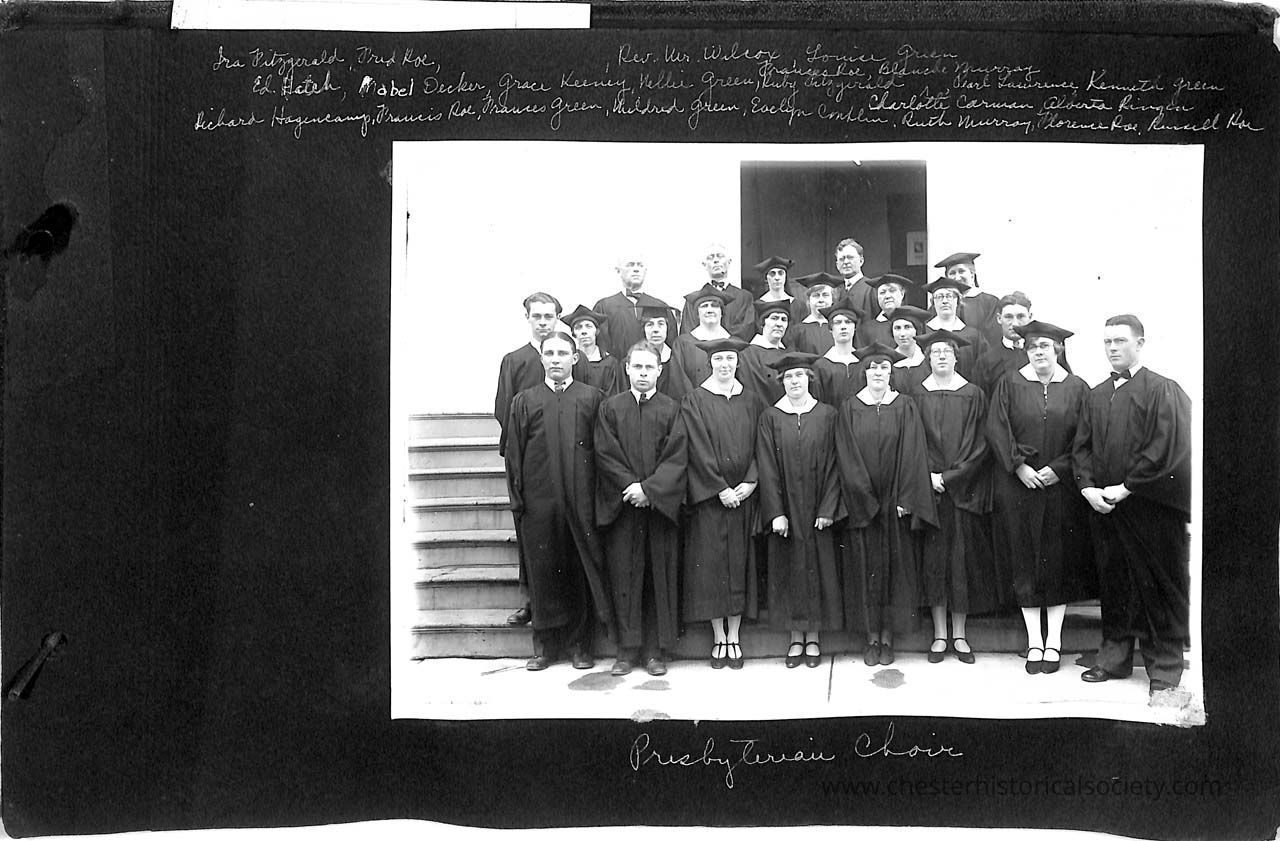Page 29 Presbyterian Choir: Ira Fitzgerald, Fred Roe, ___, Rev. Mr. Wilcox, Louise Green, Ed Hatch, Mable Decker, Grace Keeney,Nellie Green, Ruby Fitzgerald, Pearl Lawrence, Kenneth Green, Charlottle Carman, Alberta Ringen, Richard Hagencamp, Francis Roe, Frances Green, Mildred Green, Evelyn Conklin, Ruth Murray, Florence Roe, Russell Roe