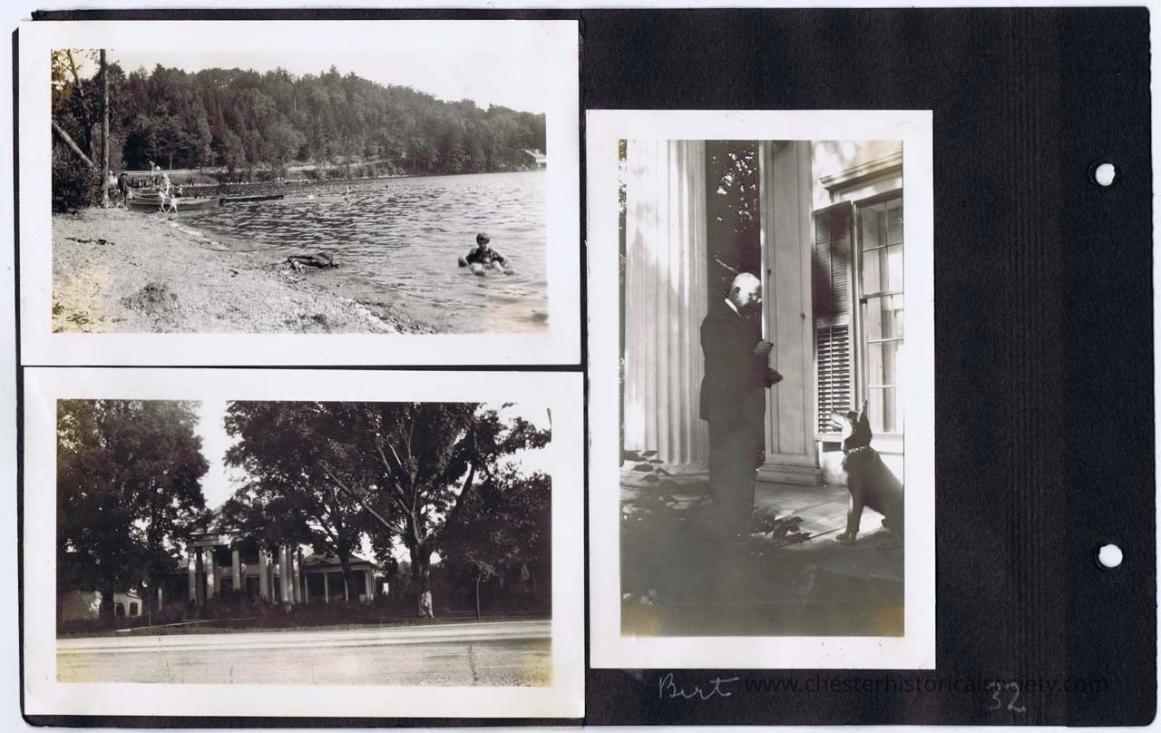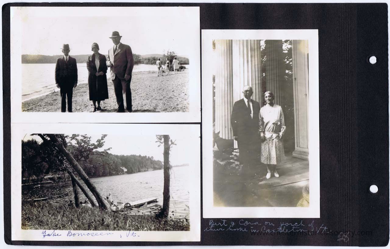 page 28 (beach scene); Lake Bomoseen, Vt.; Bert & Cora on porch of their home in Castleton, Vt.