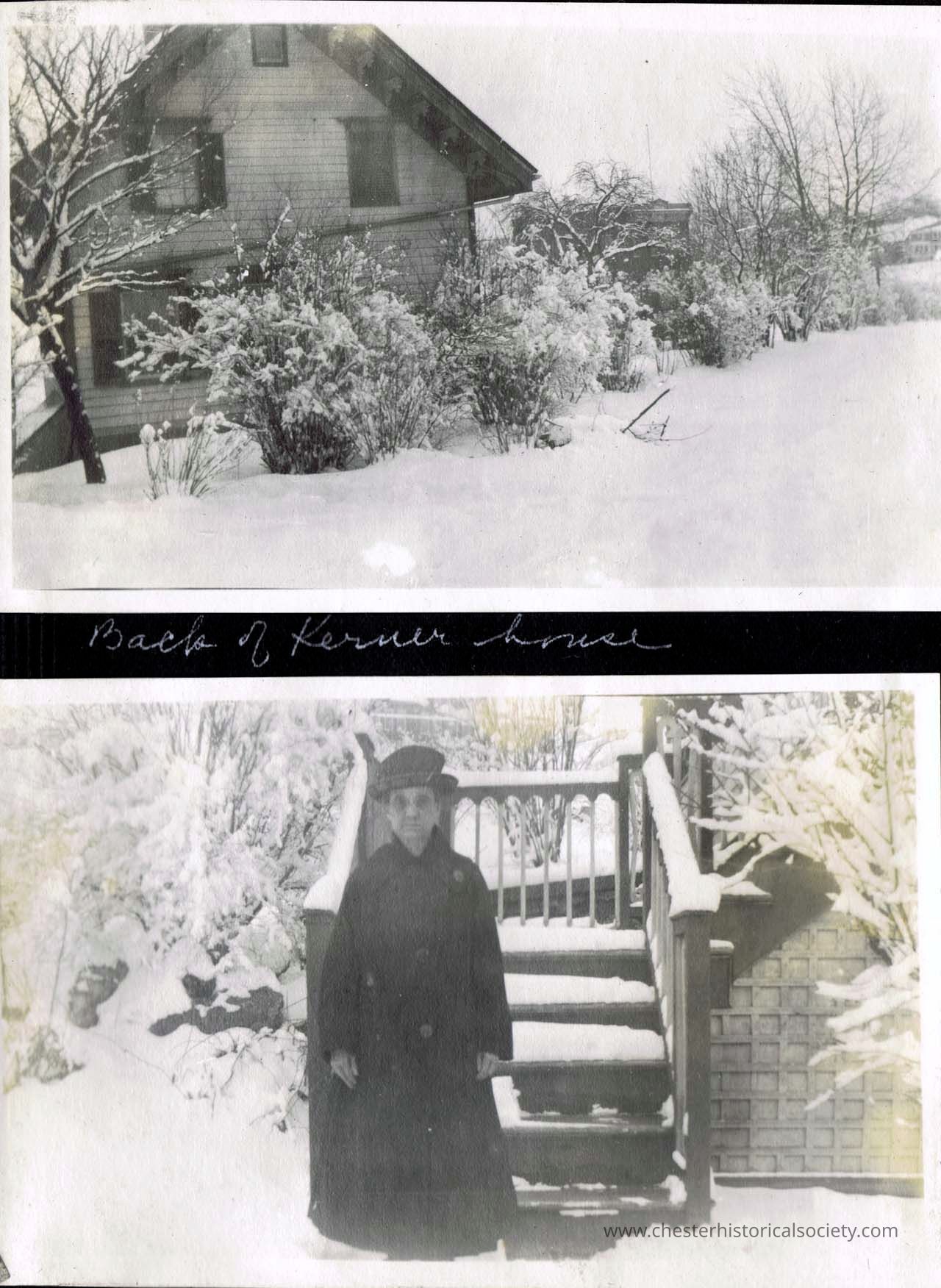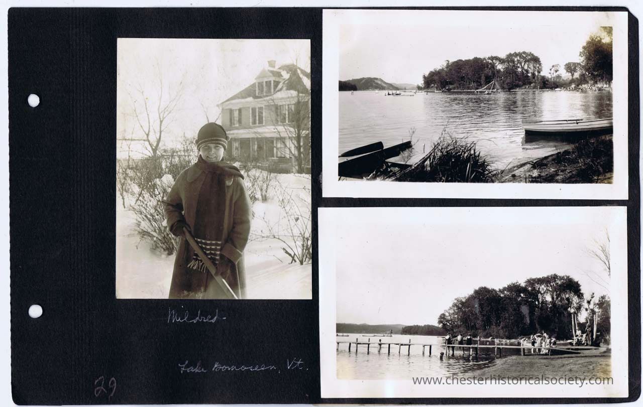page 29 Mildred (shoveling snow - 77 Main Street in background); Bo,seen Lake, Vt. (two photos)