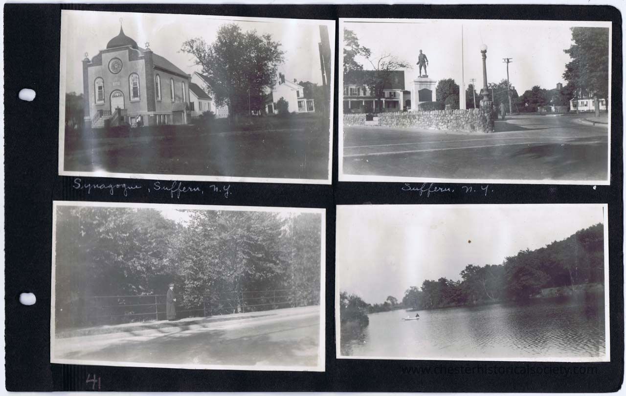 page 41 Synagogue , Suffern, N. Y.; (monument at) Suffern, N.Y.; (lady along rail); (lake scene)
