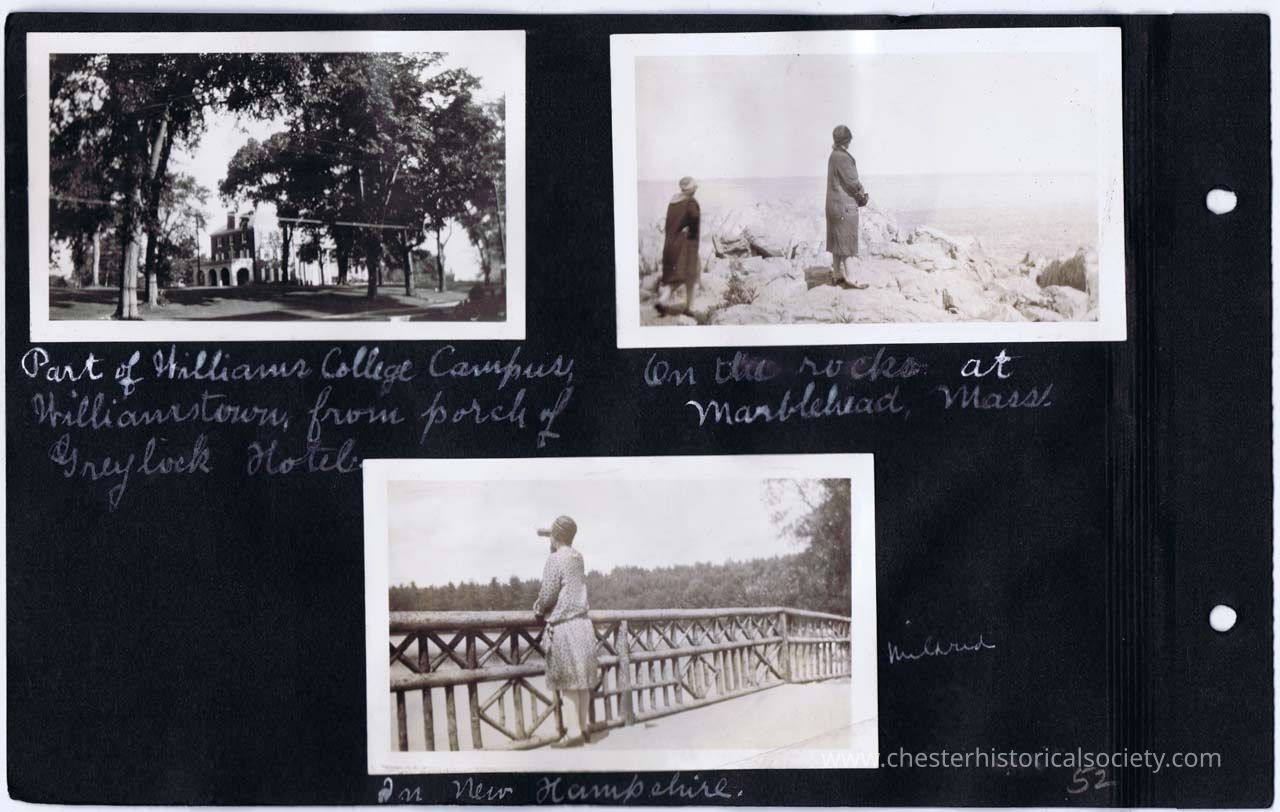 page 52 Part of Williams College Campus, Williamstown, from porch of Greylock Hotel; On the rocks at Marblehead, Mass.; Mildred in New Hampshire
