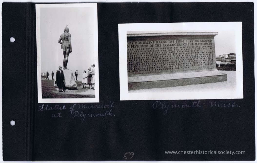 page 59 Statue of Mussasoit at Plymouth; (Monument to first burial ground of Mayflower Passengers at) Plymouth Mass.