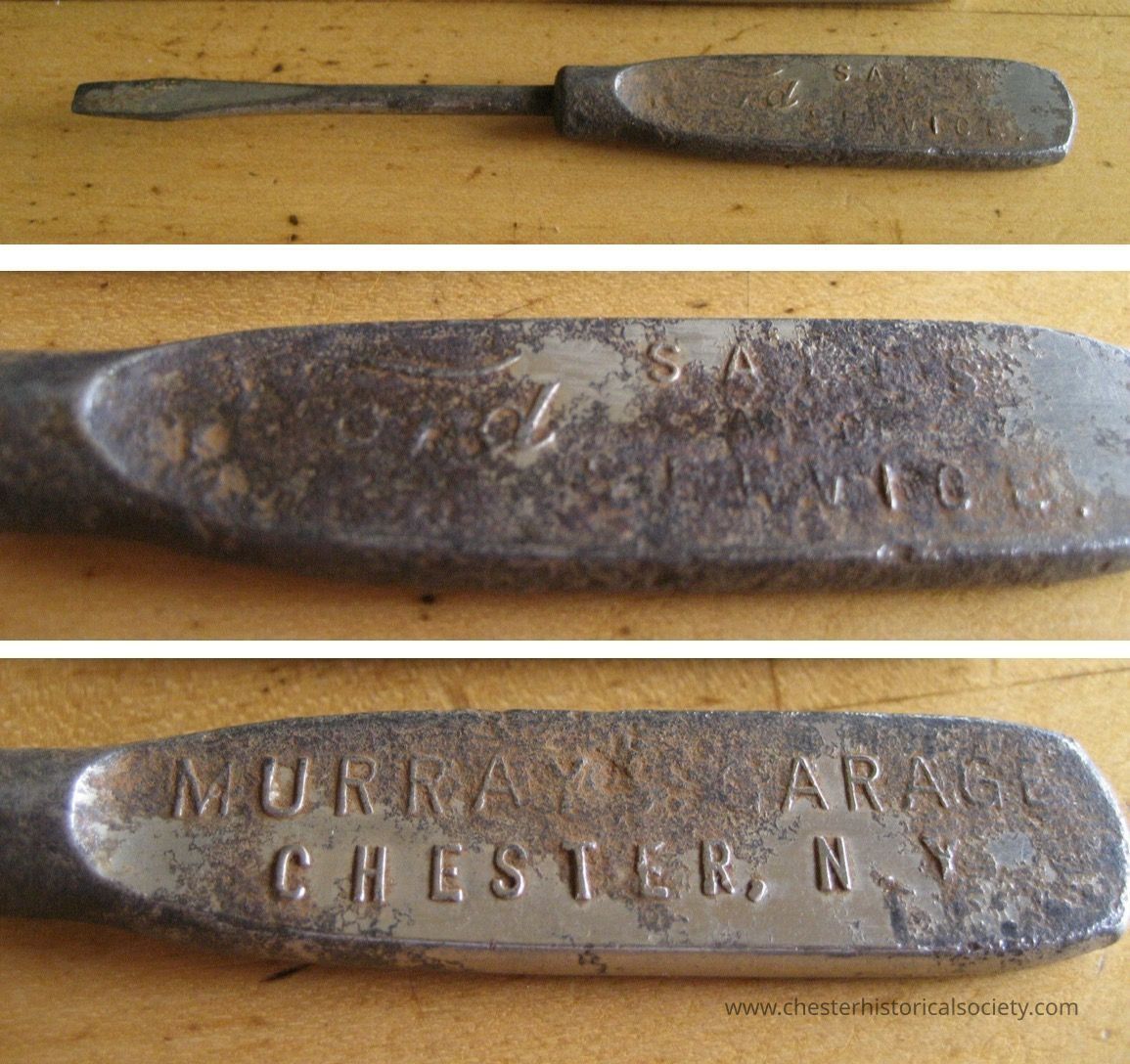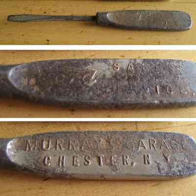 This vintage metal screwdriver with a flat blade, accompanied by embossed text on its handle, was offered for sale in 2021 on eBay. One side of the handle reads "MURRAY'S GARAGE CHESTER, N.Y.," while the other reads "Ford Sales [and] Service."Context