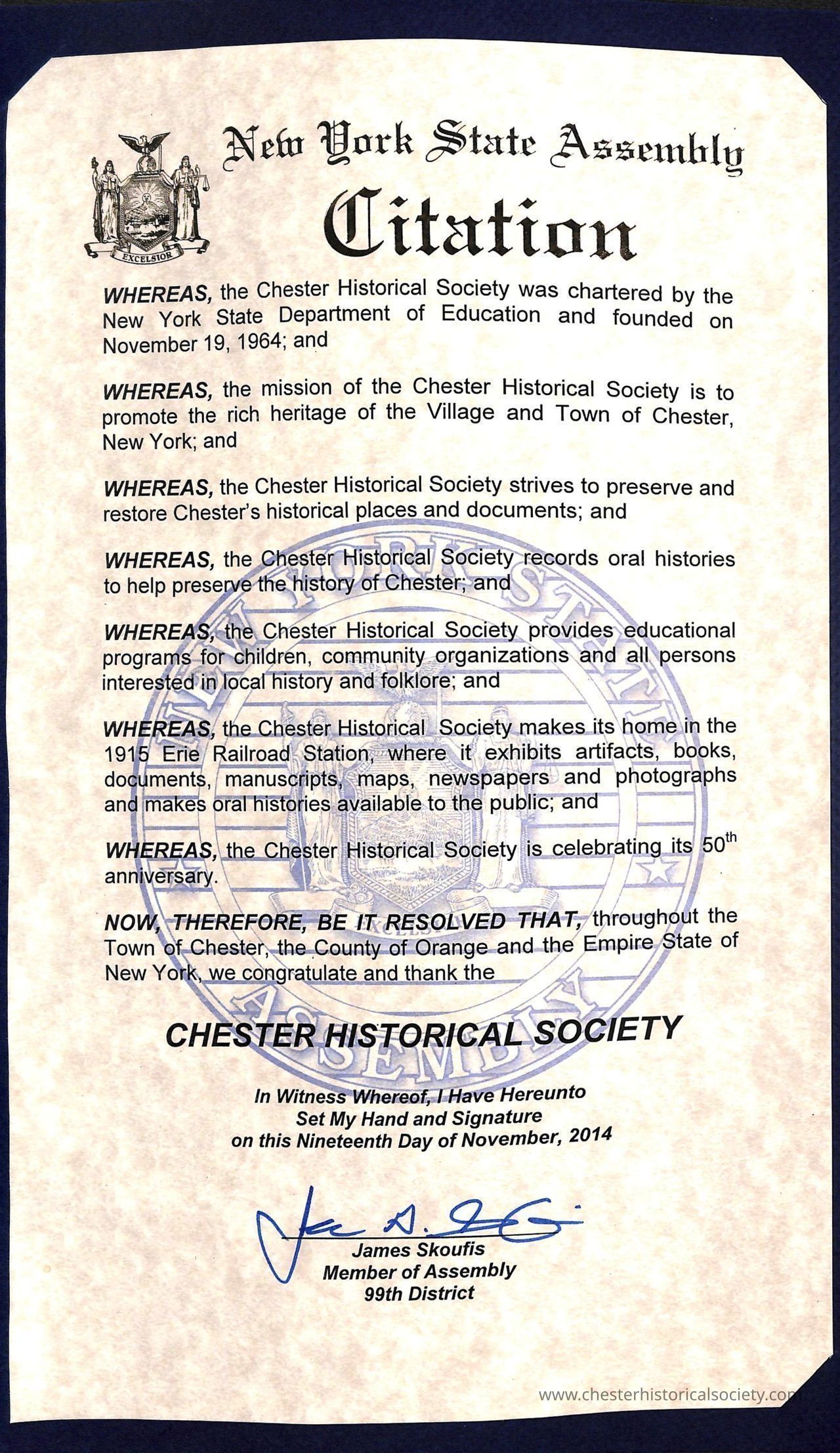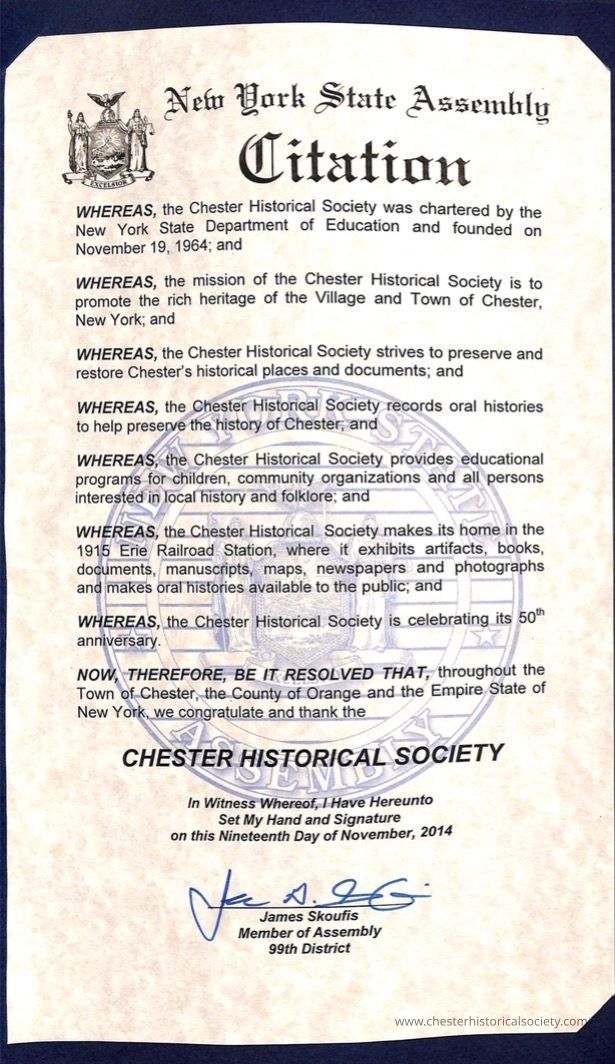 WHEREAS, the Chester Historical Society was chartered by the New York State Department of Education and founded on November 19, 1964; and