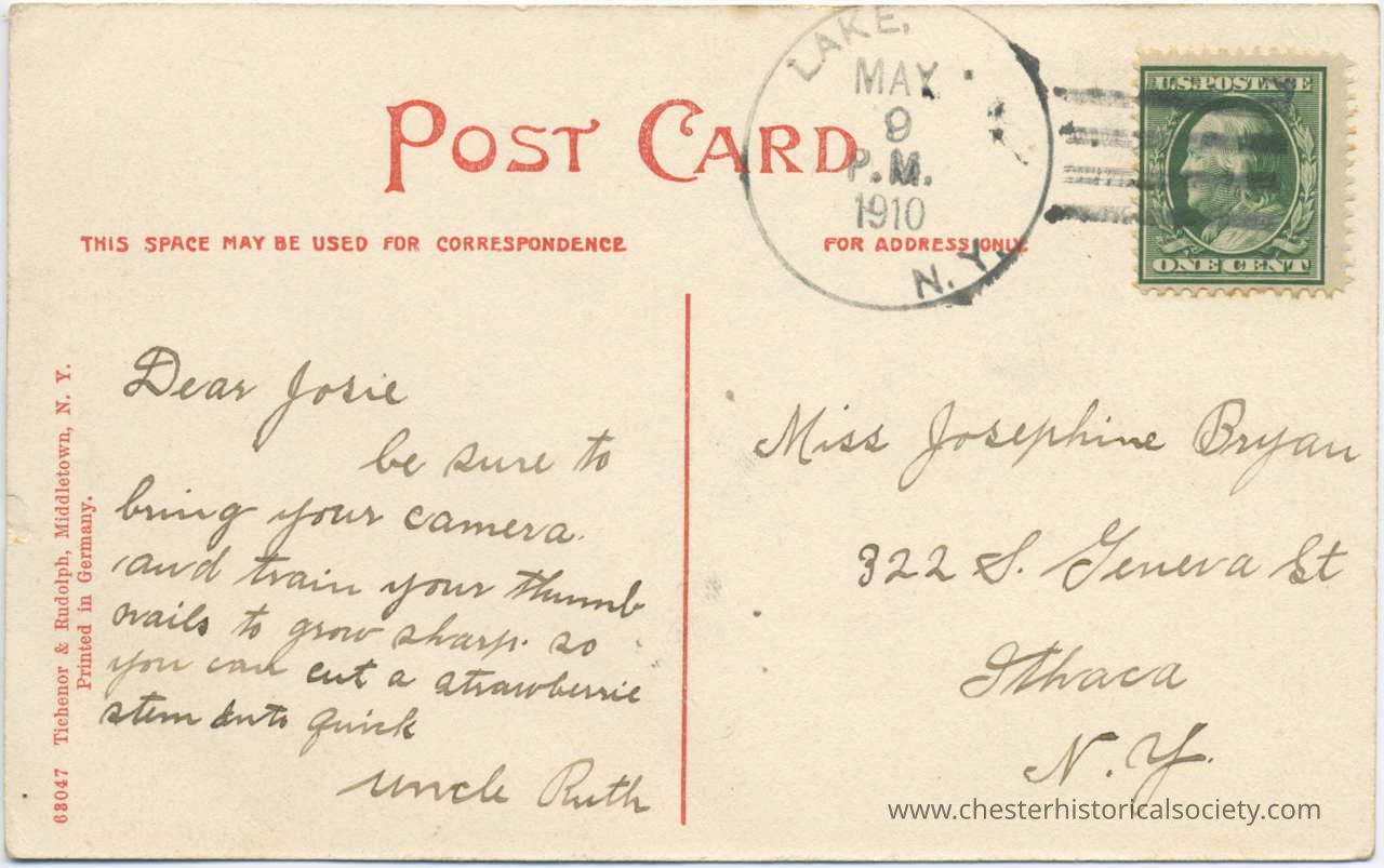 The image depicts the back of this vintage postcard postmarked May 9, 1910, from Lake, N.Y. It features a one-cent postage stamp with Benjamin Franklin's portrait. The handwritten message addresses Miss Josephine Bryan, urging her to bring her camera and train her thumbnails to grow sharp. So she can cut strawberry stems into the quick, signed by "Uncle Ruth." There is a red dividing line suggesting the left side for correspondence and the right side for the address.Subject Place