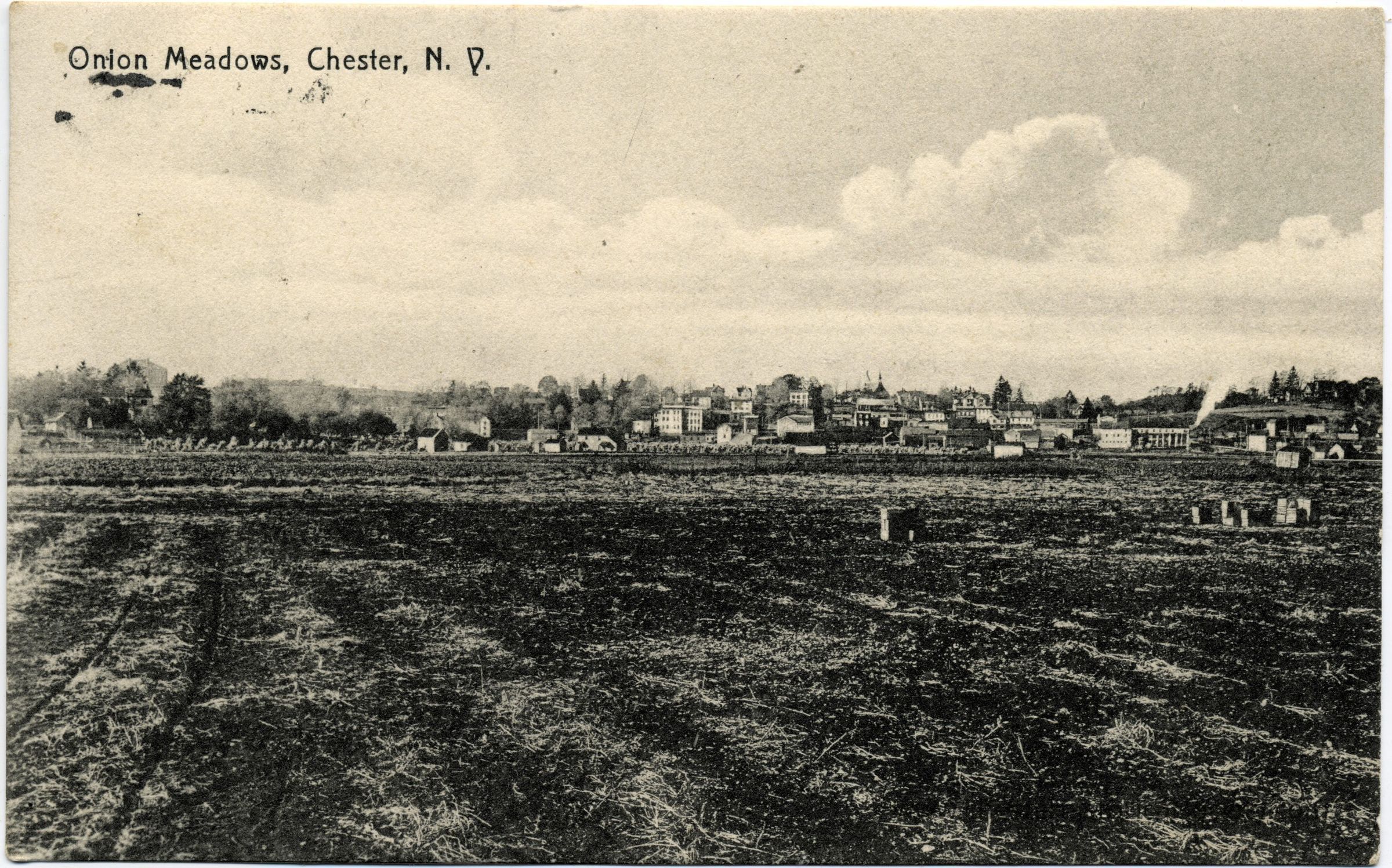 The image portrays a vintage black-and-white postcard titled "Onion Meadows, Chester, N.Y." It captures a broad expanse of agricultural fields in the foreground, which appear to be tilled and possibly prepared for planting, under a light sky with soft clouds. Beyond the fields, a collection of small buildings, possibly homes and barns, forms a quaint rural community. The layout and architecture of the buildings suggest a small, closely-knit town, typical of early 20th-century American rural settings. In the distance, mature trees line the horizon, further emphasizing the pastoral charm of the area. The entire scene conveys a serene atmosphere of rural life, illustrating a moment in the history of Chester, New York.