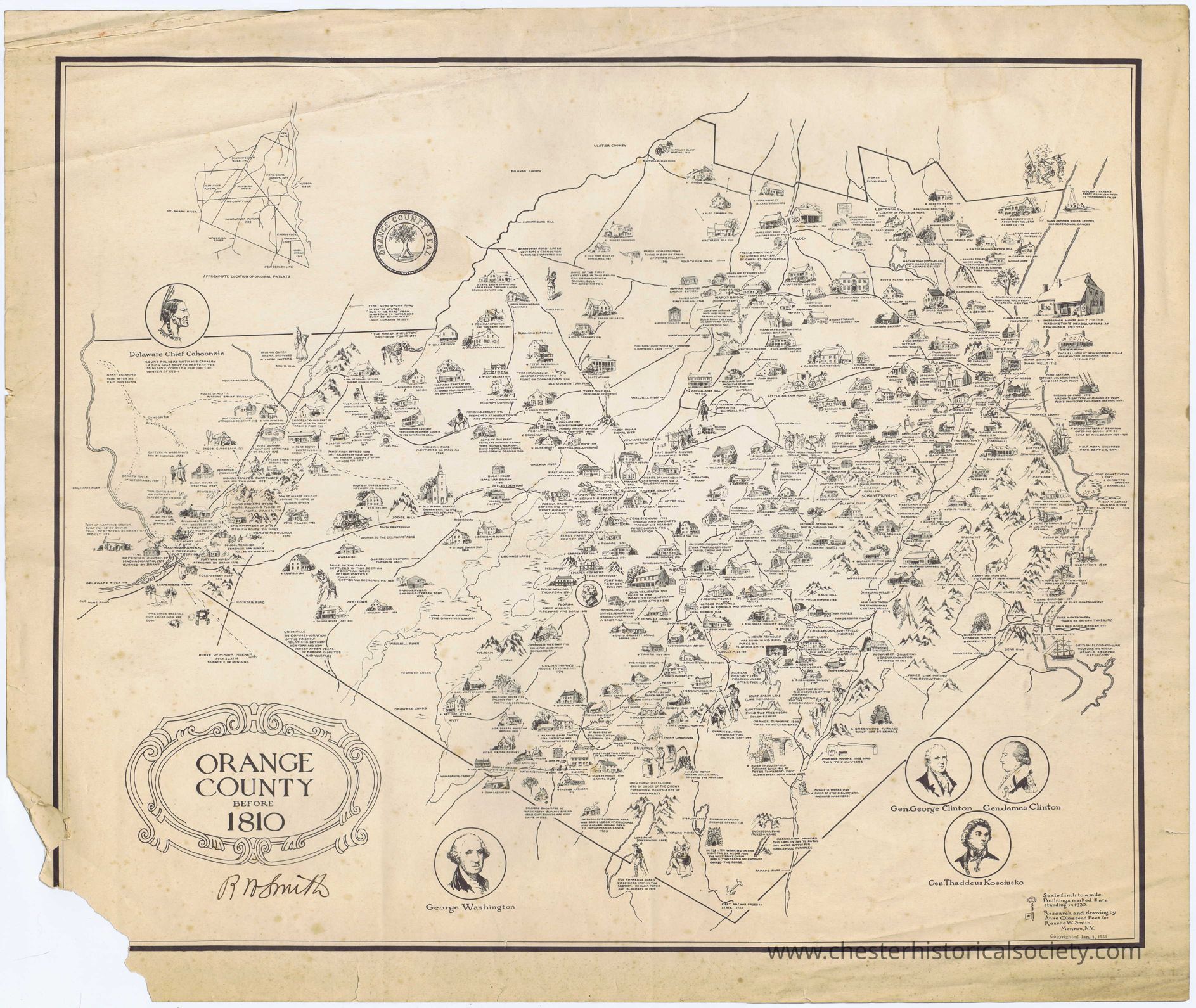 The map depicting Orange County before 1810 is intricately illustrated, depicting various historical sites, landmarks, and notable figures such as George Washington and Delaware Chief Cahoonzie, with detailed drawings of buildings, natural features, and roads, accompanied by explanations and captions. It includes a small inset map of transportation routes, and features a decorative border. The historical and geographical details offer a glimpse into the county’s past, highlighting significant locations and events of that era.