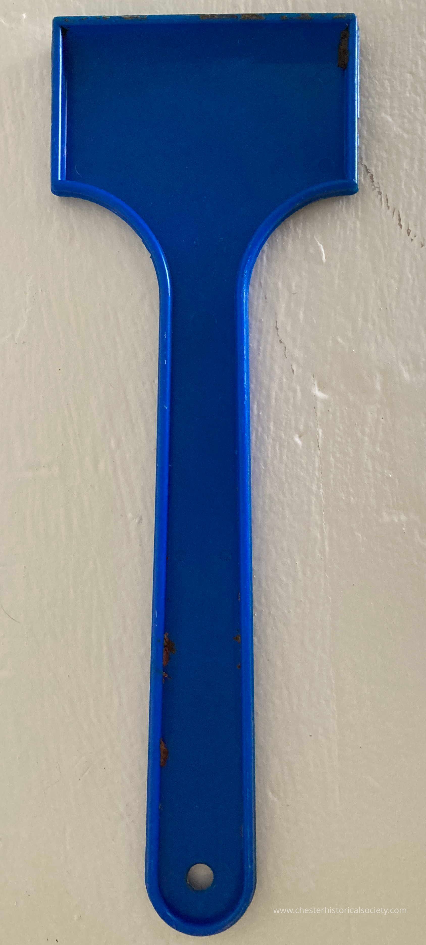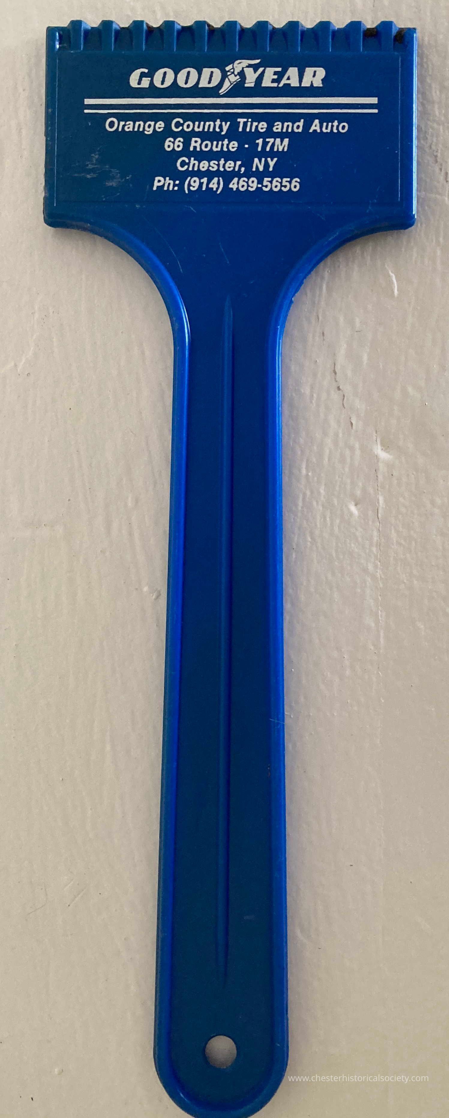 This image displays a blue plastic ice scraper branded with the GoldYear logo and the contact details, "Orange County Tire and Auto, 66 Route 17M, Chester, NY, Ph: (914) 469-5656," on its handle, a promotional item from that business. The scraper's design is simple, with serrated teeth on one end and a solid handle, for removing ice from car windows.