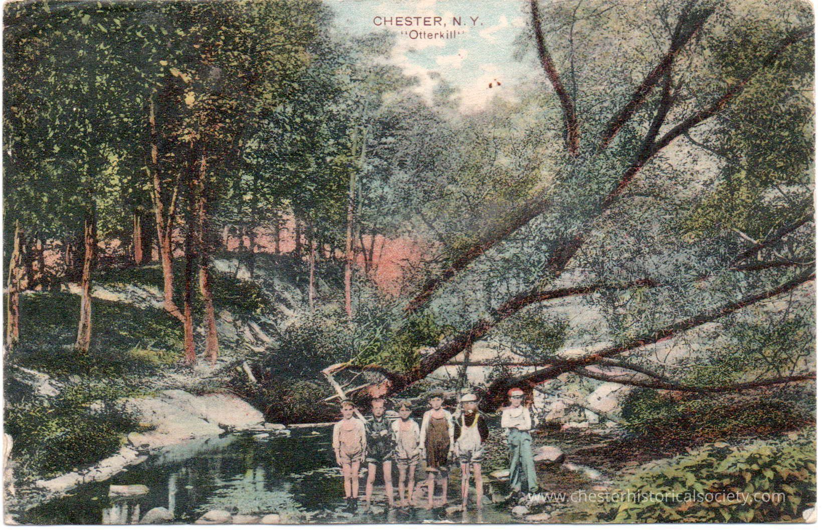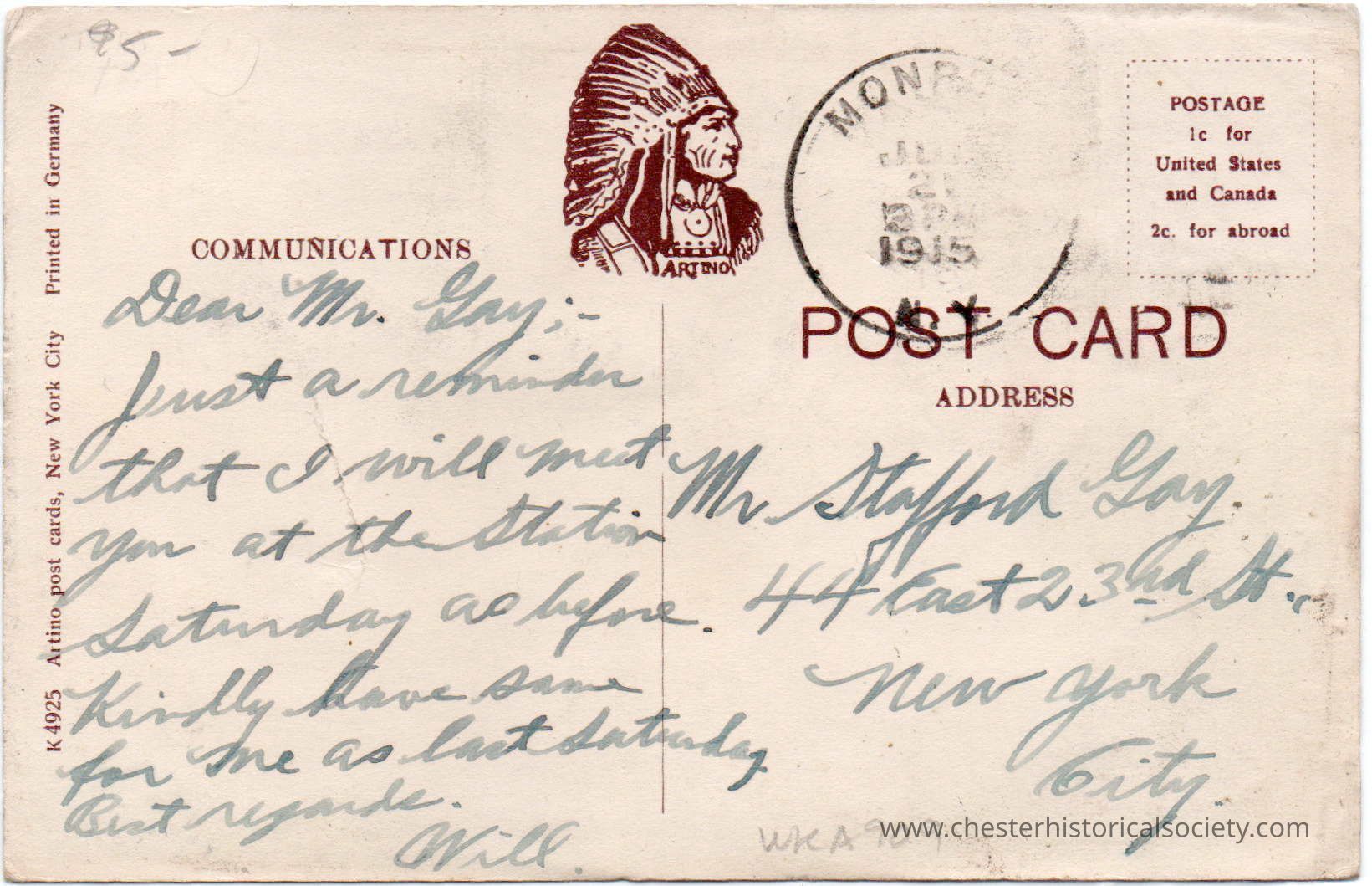 This photo postcard depicts a serene scene at "Otterkill" in Chester, N.Y., showcasing a group of six young boys standing in the Otterkill Creek, surrounded by lush greenery and dense forests, creating an idyllic and tranquil moment captured in bright, colorized tones. The address side of this old postcard, dated July 21, 1915, according to the postmark from Monroe, NY. The card, addressed to Mr. Stafford Gay, at 144 East 23rd St., New York City, includes handwritten text that plans a meeting at the station on the following Saturday. Additionally, it features the Artino Post Card Company's logo of an American Indian in profile and text boxes stating postage rates. The card notes it was printed in Germany.Subject Place