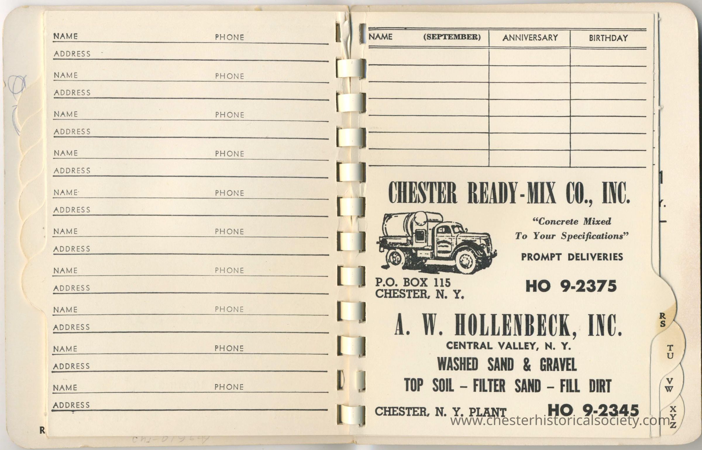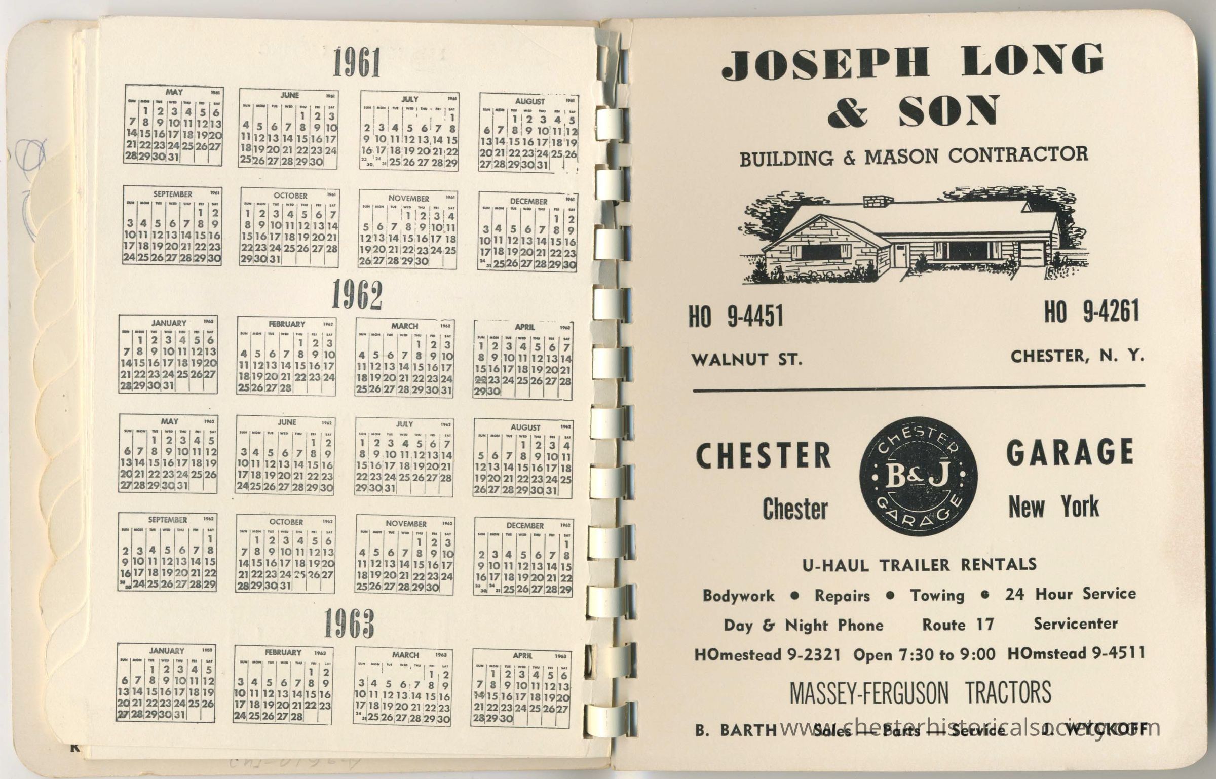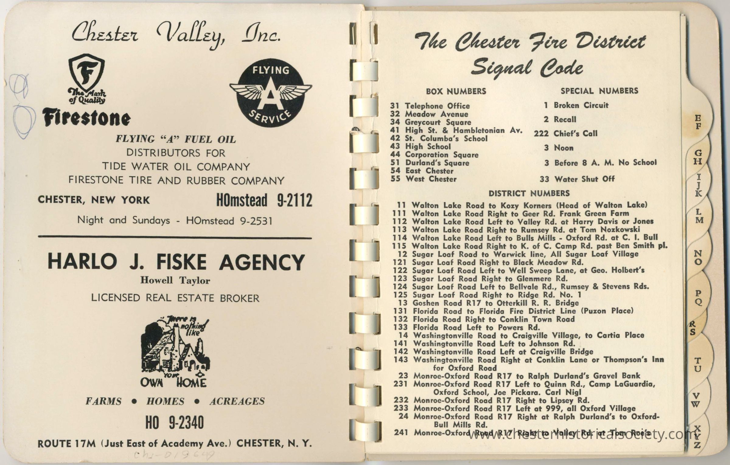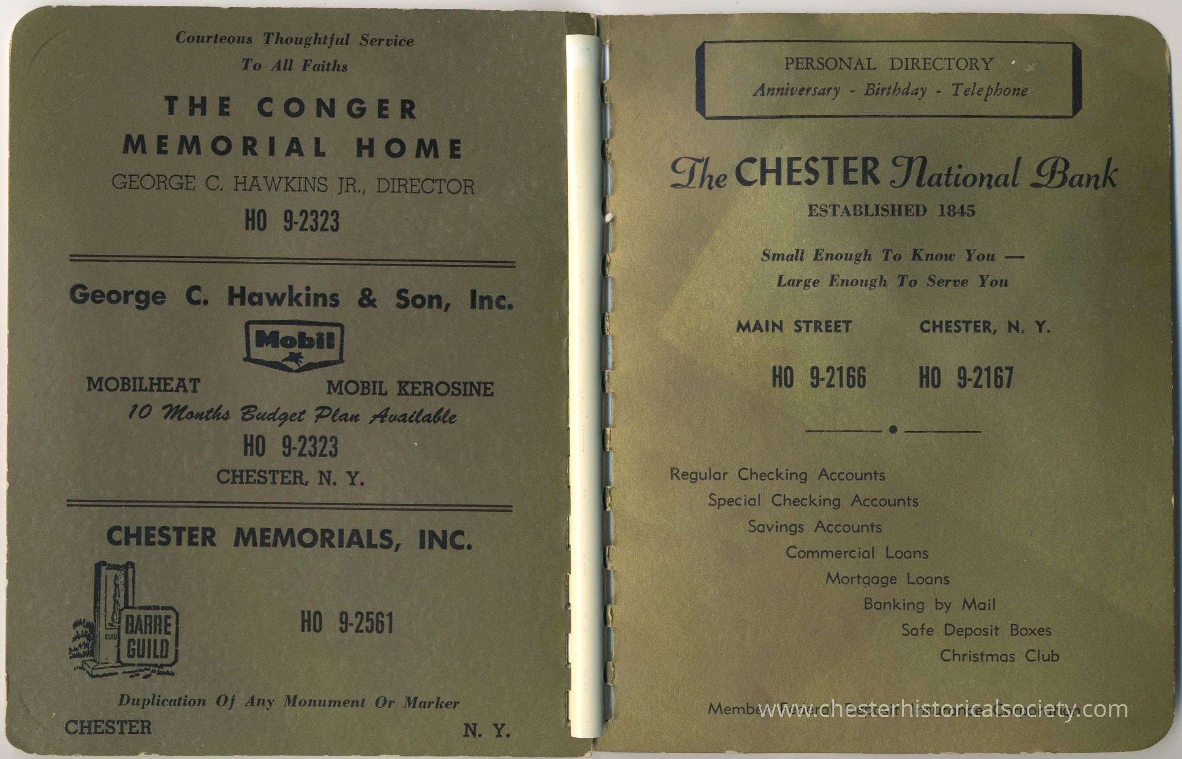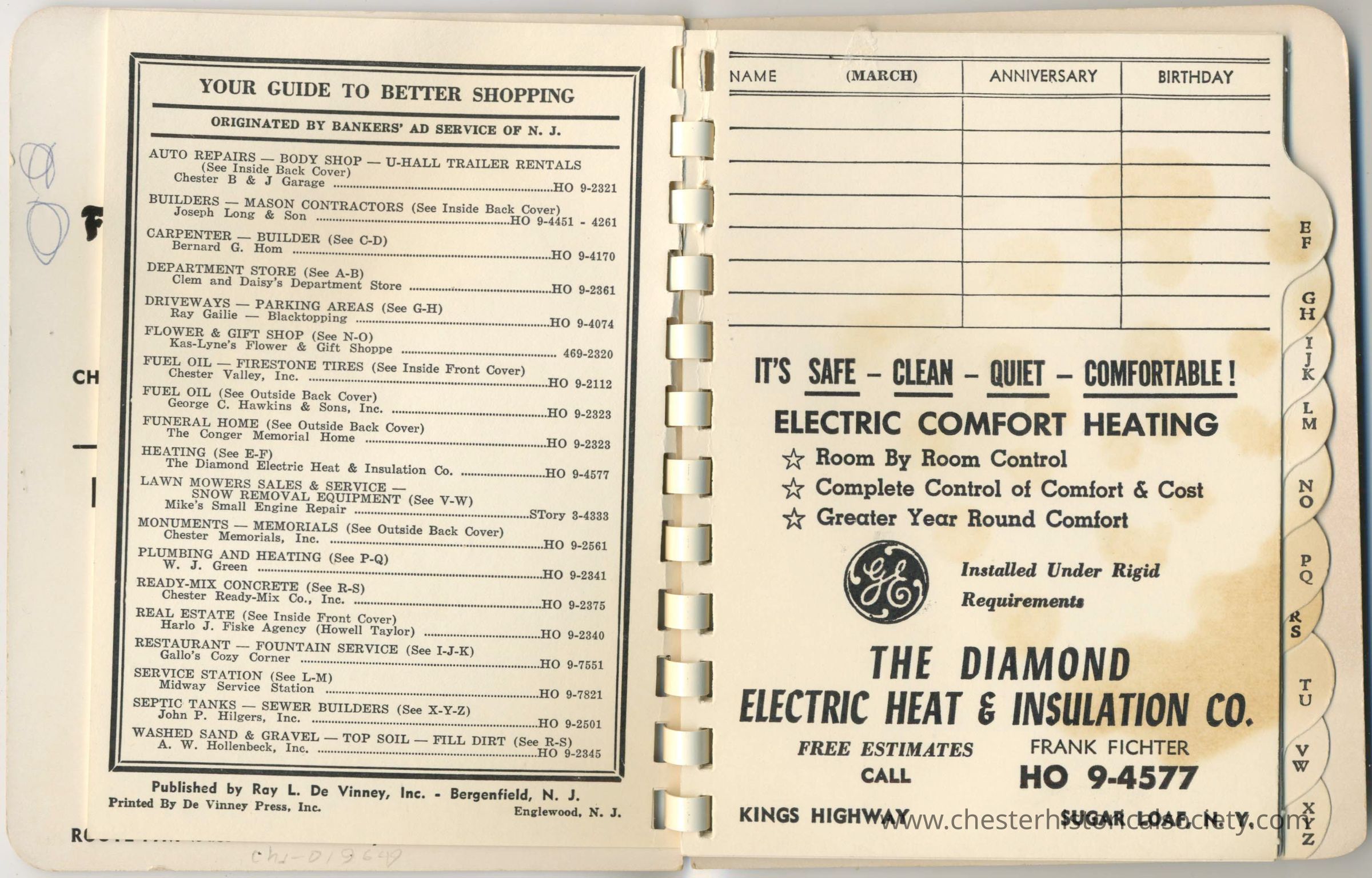 Advertisement Accession completed Personal Directory Anniversary Birthday - Telephone The Chester National Bank Established 1845 Small Enough To Know You Large Enough To Serve You Main Street Chester, N. Y. HO 9-2166 HO 9-2167 ––––•–––– Regular Checking Accounts Special Checking Accounts Savings Accounts Commercial Loans Mortgage Loans Banking by Mail Safe Deposit Boxes Christmas Club Member Federal Deposit Insurance Corporation [page 2] Chester Valley, Inc. Flying "A." Fuel Oil Distributors For Tide Water Oil Company Firestone Tire And Rubber Company Chester, New York HOmstead 9-2112 Night and Sundays - HOmstead 9-2531 –––––––––––––––––––- Harlo J. Fiske Agency Howell Taylor Licensed Real Estate Broker Farms • Homes • Acreages HO 9-2340 Route 17M (Just East of Academy Ave.) Chester, N. Y. [page 3] The Chester Fire District Signal Code Box Numbers Special Numbers 31 Telephone Office 1 Broken Circuit 32 Meadow Avenue 2 Recall 34 Greycourt Square 222 Chief's Call 41 High St. & Hambletonian Av. 42 St. Columba's School 43 High School 3 Noon 44 Corporation Square 51 Durland's Square 3 Before 8 A. M. No School 54 East Chester 55 West Chester 33 Water Shut Off District Numbers 11 Walton Lake Road to Kozy Korners (Head of Walton Lake) 111 Walton Lake Road Right to Geer Rd. Frank Green Farm 112 Walton Lake Road Left to Valley Rd. at Harry Davis or Jones 113 Walton Lake Road Right to Rumsey Rd. at Tom Nozkowski 114 Walton Lake Road Left to Bulls Mills - Oxford Rd. at C. I. Bull 115 Walton Lake Road Right to K. of C. Camp Rd. past Ben Smith pl. 12 Sugar Loaf Road to Warwick line, All Sugar Loaf Village 121 Sugar Loaf Road Right to Black Meadow Rd. 122 Sugar Loaf Road Left to Well Sweep Lane, at Geo. Holbert's 123 Sugar Loaf Road Right to Glenmere Rd. 124 Sugar Loaf Road Left to Bellvale Rd., Rumsey & Stevens Rds. 12S Sugar Loaf Road Right to Ridge Rd. No. 1 13 Goshen Road R 17 to Otterkill R. R. Bridge 131 Florida Road to Florida Fire District Line (Puzon Place) 132 Florida Road Right to Conklin Town Road 133 Florida Road Left to Powers Rd. 14 Washingtonville Road to Craigville Village, to Cartia Place 141 Washingtonville Road Left to Johnson Rd. 142 Washingtonville Road Left at Craigville Bridge 143 Washingtonville Road Right at Conklin Lane or Thompson's Inn for Oxford Road 23 Monroe-Oxford Road Rl 7 to Ralph Durland's Gravel Bank 231 Monroe-Oxford Road R17 Left to Quinn Rd., Camp LaGuardia, Oxford School, Joe Pickara. Carl Nigl 232 Monroe-Oxford Road R 17 Right to Lipsey Rd. 233 Monroe-Oxford Road R 17 Left at 999, all Oxford Village 24 Monroe-Oxford Road R 17 Right at Ralph Durland's to Oxford-Bull Mills Rd. 241 Monroe-Oxford Road R17 Right to Valley Rd. at Tom Roe's [page 4] Your Guide To Better Shopping Originated By Bankers' Ad Service of N. J. ––––––––––––––– Auto Repairs - Body Shop - U-Hall Trailer Rentals (See Inside Back Cover) Chester B & J Garage HO 9-2321 Builders - Mason Contractors (See Inside Back Cover) Joseph Long & Son HO 9-4451 - 4261 Carpenter - Builder (See C-D) Bernard G. Hom HO 9-4170 Department Store (See A-B) Clem and Daisy's Department Store HO 9-2361 Driveways - Parking Areas (See G-H) Ray Gailie - Blacktopping HO 9-4074 Flower & Gift Shop (See N-O) Kas-Lyne's Flower & Gift Shoppe 469-2320 Fuel Oil - Firestone Tires (See Inside Front Cover) Chester Valley, Inc. HO 9-2112 Fuel Oil (See Outside Back Cover) George C. Hawkins & Sons, Inc. HO 9-2323 Funeral Home (See Outside Back Cover) The Conger Memorial Home HO 9-2323 Heating (See E-F) The Diamond Electric Heat & Insulation Co. HO 9-4577 Lawn Mowers Sales & Service - Snow Removal Equipment (See V-W) Mike's Small Engine Repair STory 3-4333 Monuments - Memorials (See Outside Back Cover) Chester Memorials, Inc. HO 9-2561 Plumbing And Heating (See P-Q) W. J. Green HO 9-2341 Ready-Mix Concrete (See R-S) Chester Ready-Mix Co., Inc. HO 9-2375 Real Estate (See Inside Front Cover) Harlo J. Fiske Agency (Howell Taylor) HO 9-2340 Restaurant - Fountain Service (See I-J-K) Gallo's Cozy Corner HO 9-7551 Service Station (See L-M) Midway Service Station HO 9-7821 Septic Tanks - Sewer Builders (See X-Y-Z) John P. Hilgers, Inc. HO 9-2501 Washed Sand & Gravel -Top Soil - Flll Dirt (See R-S) A. W. Hollenheck, Inc. HO 9-2345 ––––––––––––– Published by Ray L. De Vinney, Inc. - Bergenfield, N. J. Printed By De Vinney Press, Inc. Englewood, N. J, [page 5] Name (March) | Anniversary | Birthday –––––––––––––– It's Safe - Clean - Quiet - Comfortable! Electric Comfort Heating * Room By Room Control * Complete Control of Comfort & Cost * Greater Year Round Comfort GE Installed Under Rigid Requirement. The Diamond Electric Heat 6 Insulation Co. Free Estimates Frank Fichter Call HO 9-4577 Kings Highway Sugar Loaf, N. Y. [page 6] Name Phone Address [page 7] Name (April) | Anniversary | Birthday –––––––––––––– Ray Gailie Blacktopping HO 9-4074 Asphalt Paving • Drives • Walks • Parking Areas Laroe Road Chester, N. Y. [page 8] Name Phone Address [page 9] Name (May) | Anniversary | Birthday –––––––––––––– "Find Food and a Friendly Atmosphere" Gallo's Cozy Corner Vince & Margo Gallo Luncheon - Dinner - Breakfast Served Stop In and Enjoy Our Hero Sandwiches Fountain Service - Ice Cream - Soda Open 6 A.M. 'Til Midnight 7 Days A Week Cor. Rts. 94 & 17 M Chester, N. Y. HO 9-7551 [page 10] Name Phone Address [page 11] Name (June) | Anniversary | Birthday –––––––––––––– Midway Service Station Tydol- Veedol Lubrication - Accessories Flying A Service Route 17M Chester, N. Y. HOmestead 9-7821 [page 12] Name Phone Address [page 13] Name (July) | Anniversary | Birthday –––––––––––––– KAS-LYNE'S Flower & Gift Shoppe FLOWERS, PLANTS, CANDY & GIFTWARE "FOR EVERY OCCASION" CORSAGES, WEDDING BOUQUETS, FUNERAL DESIGN