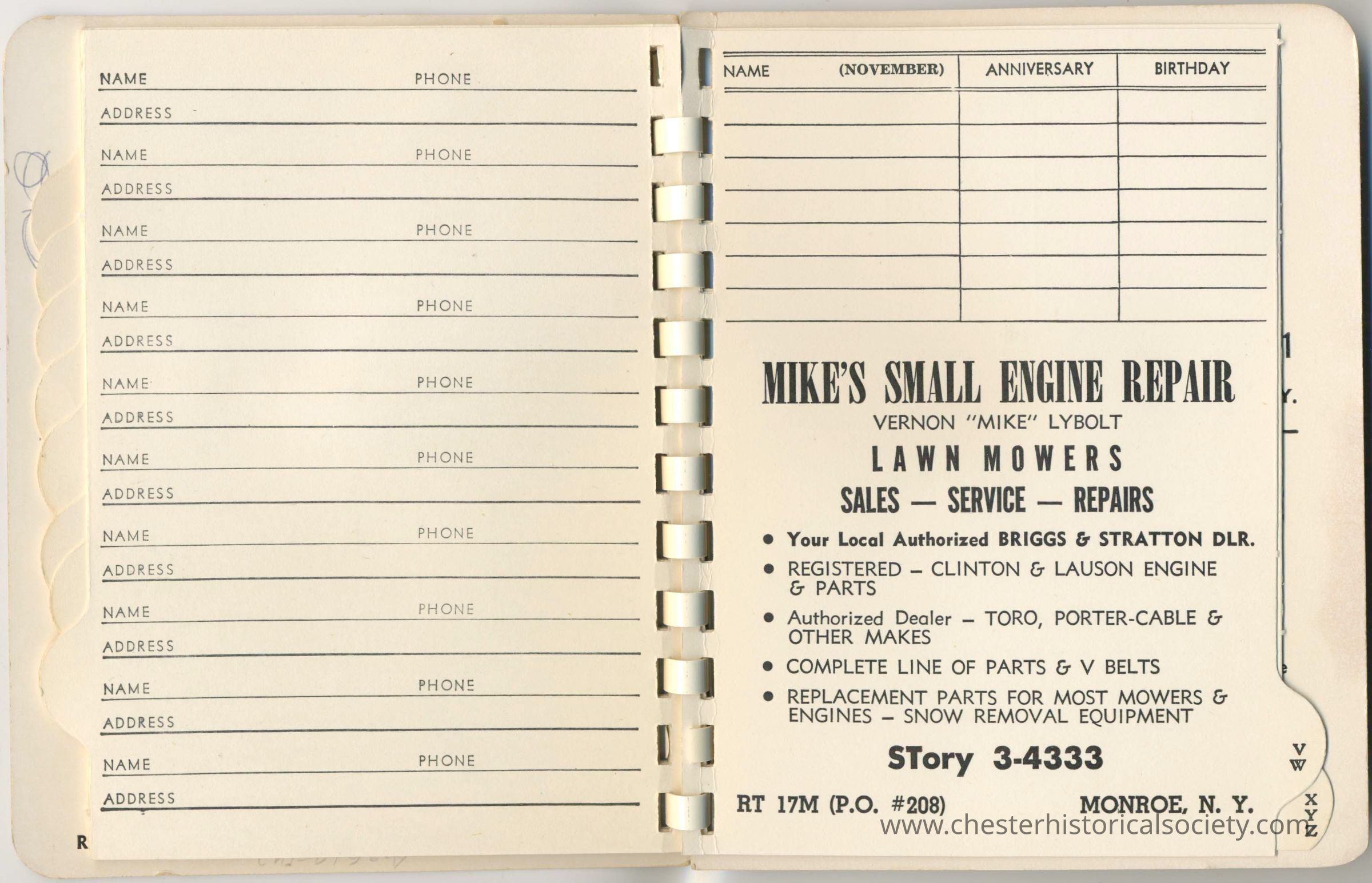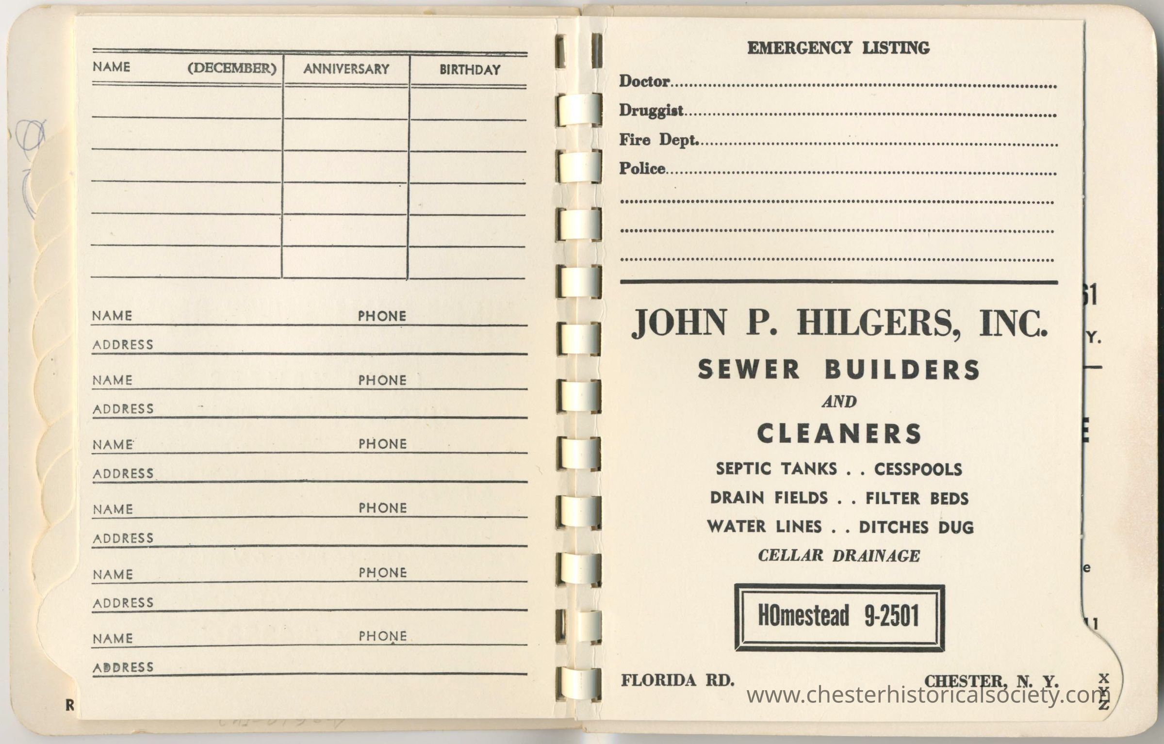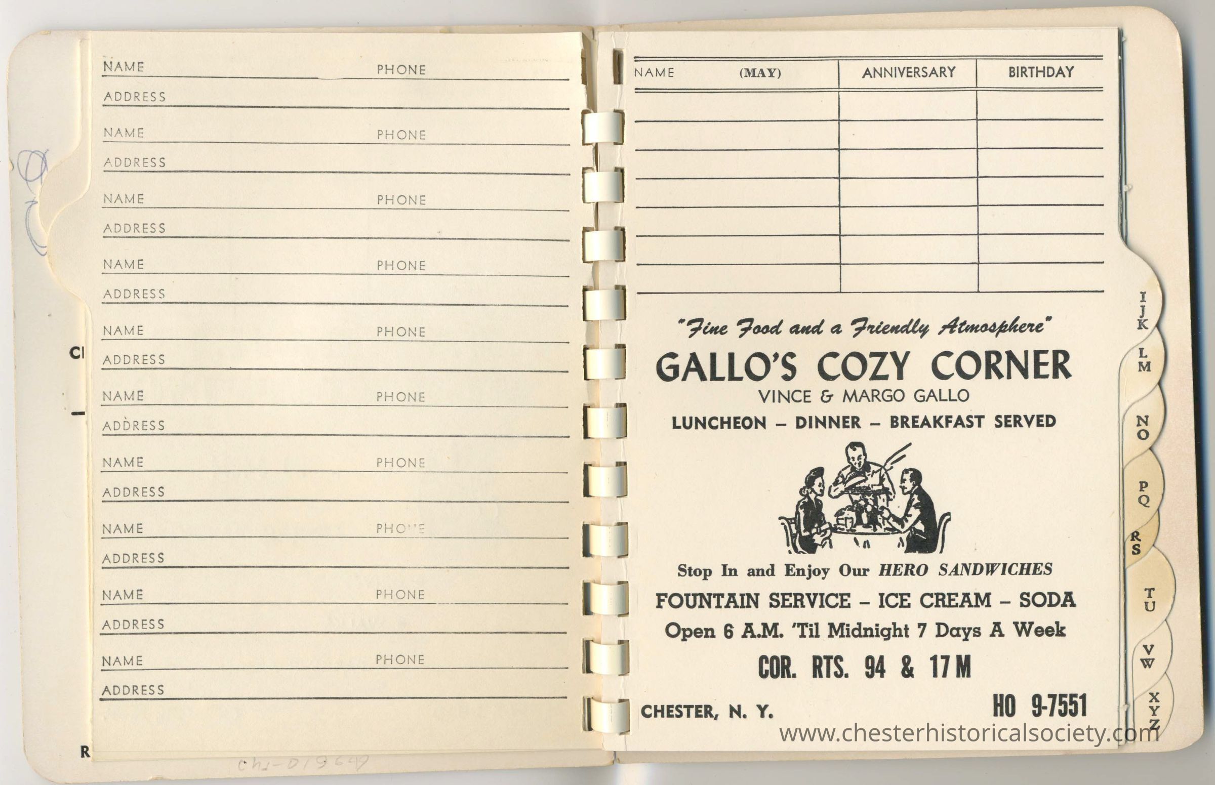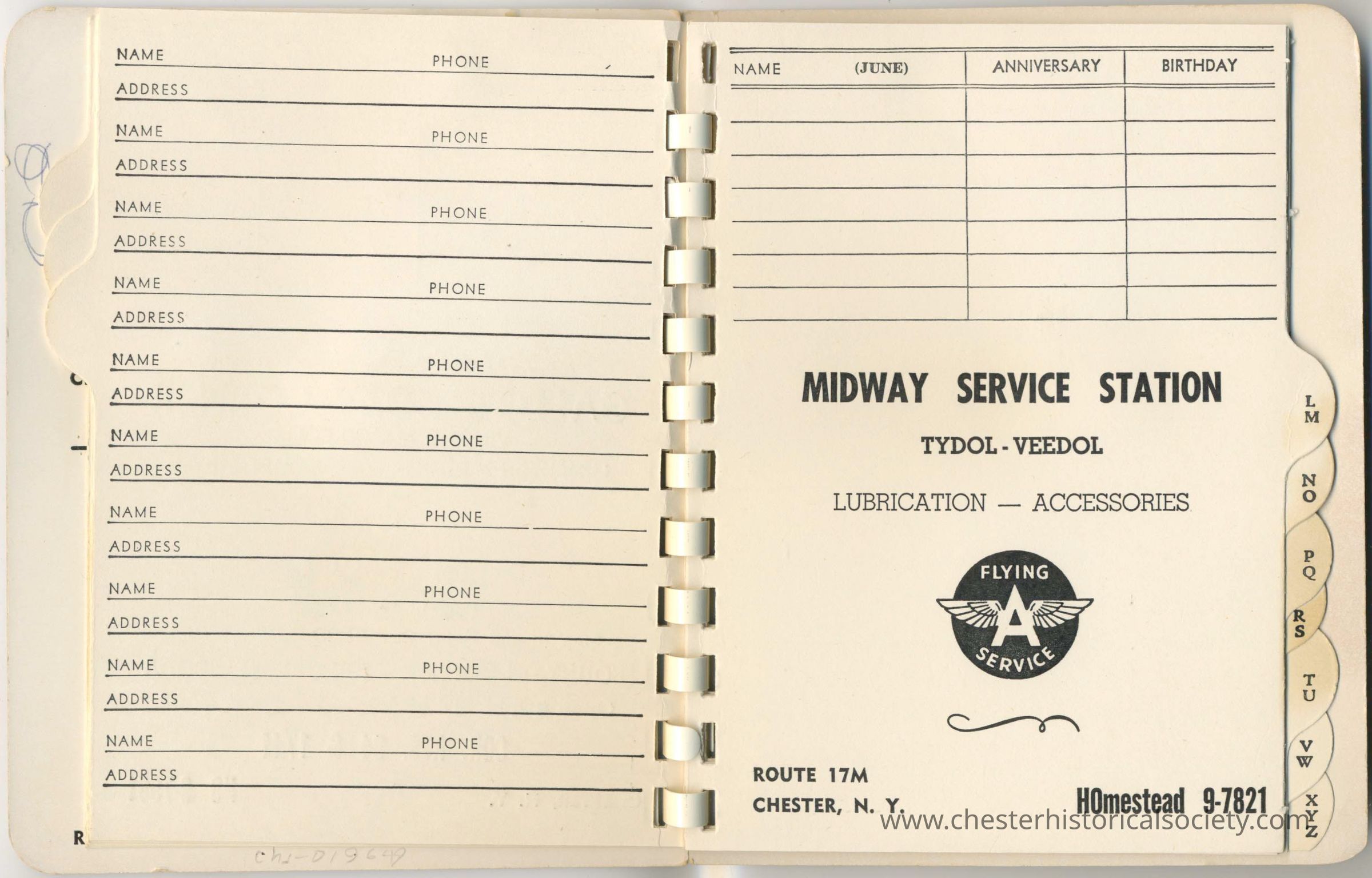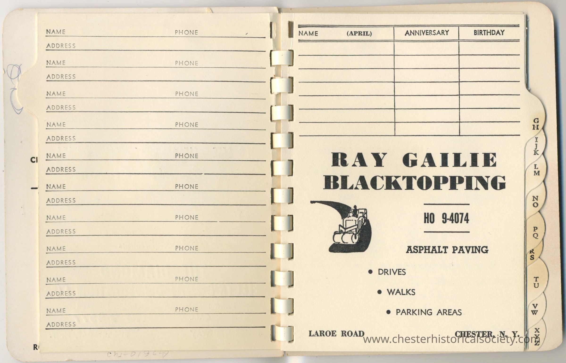 Advertisement Accession completed Personal Directory Anniversary Birthday - Telephone The Chester National Bank Established 1845 Small Enough To Know You Large Enough To Serve You Main Street Chester, N. Y. HO 9-2166 HO 9-2167 ––––•–––– Regular Checking Accounts Special Checking Accounts Savings Accounts Commercial Loans Mortgage Loans Banking by Mail Safe Deposit Boxes Christmas Club Member Federal Deposit Insurance Corporation [page 2] Chester Valley, Inc. Flying "A." Fuel Oil Distributors For Tide Water Oil Company Firestone Tire And Rubber Company Chester, New York HOmstead 9-2112 Night and Sundays - HOmstead 9-2531 –––––––––––––––––––- Harlo J. Fiske Agency Howell Taylor Licensed Real Estate Broker Farms • Homes • Acreages HO 9-2340 Route 17M (Just East of Academy Ave.) Chester, N. Y. [page 3] The Chester Fire District Signal Code Box Numbers Special Numbers 31 Telephone Office 1 Broken Circuit 32 Meadow Avenue 2 Recall 34 Greycourt Square 222 Chief's Call 41 High St. & Hambletonian Av. 42 St. Columba's School 43 High School 3 Noon 44 Corporation Square 51 Durland's Square 3 Before 8 A. M. No School 54 East Chester 55 West Chester 33 Water Shut Off District Numbers 11 Walton Lake Road to Kozy Korners (Head of Walton Lake) 111 Walton Lake Road Right to Geer Rd. Frank Green Farm 112 Walton Lake Road Left to Valley Rd. at Harry Davis or Jones 113 Walton Lake Road Right to Rumsey Rd. at Tom Nozkowski 114 Walton Lake Road Left to Bulls Mills - Oxford Rd. at C. I. Bull 115 Walton Lake Road Right to K. of C. Camp Rd. past Ben Smith pl. 12 Sugar Loaf Road to Warwick line, All Sugar Loaf Village 121 Sugar Loaf Road Right to Black Meadow Rd. 122 Sugar Loaf Road Left to Well Sweep Lane, at Geo. Holbert's 123 Sugar Loaf Road Right to Glenmere Rd. 124 Sugar Loaf Road Left to Bellvale Rd., Rumsey & Stevens Rds. 12S Sugar Loaf Road Right to Ridge Rd. No. 1 13 Goshen Road R 17 to Otterkill R. R. Bridge 131 Florida Road to Florida Fire District Line (Puzon Place) 132 Florida Road Right to Conklin Town Road 133 Florida Road Left to Powers Rd. 14 Washingtonville Road to Craigville Village, to Cartia Place 141 Washingtonville Road Left to Johnson Rd. 142 Washingtonville Road Left at Craigville Bridge 143 Washingtonville Road Right at Conklin Lane or Thompson's Inn for Oxford Road 23 Monroe-Oxford Road Rl 7 to Ralph Durland's Gravel Bank 231 Monroe-Oxford Road R17 Left to Quinn Rd., Camp LaGuardia, Oxford School, Joe Pickara. Carl Nigl 232 Monroe-Oxford Road R 17 Right to Lipsey Rd. 233 Monroe-Oxford Road R 17 Left at 999, all Oxford Village 24 Monroe-Oxford Road R 17 Right at Ralph Durland's to Oxford-Bull Mills Rd. 241 Monroe-Oxford Road R17 Right to Valley Rd. at Tom Roe's [page 4] Your Guide To Better Shopping Originated By Bankers' Ad Service of N. J. ––––––––––––––– Auto Repairs - Body Shop - U-Hall Trailer Rentals (See Inside Back Cover) Chester B & J Garage HO 9-2321 Builders - Mason Contractors (See Inside Back Cover) Joseph Long & Son HO 9-4451 - 4261 Carpenter - Builder (See C-D) Bernard G. Hom HO 9-4170 Department Store (See A-B) Clem and Daisy's Department Store HO 9-2361 Driveways - Parking Areas (See G-H) Ray Gailie - Blacktopping HO 9-4074 Flower & Gift Shop (See N-O) Kas-Lyne's Flower & Gift Shoppe 469-2320 Fuel Oil - Firestone Tires (See Inside Front Cover) Chester Valley, Inc. HO 9-2112 Fuel Oil (See Outside Back Cover) George C. Hawkins & Sons, Inc. HO 9-2323 Funeral Home (See Outside Back Cover) The Conger Memorial Home HO 9-2323 Heating (See E-F) The Diamond Electric Heat & Insulation Co. HO 9-4577 Lawn Mowers Sales & Service - Snow Removal Equipment (See V-W) Mike's Small Engine Repair STory 3-4333 Monuments - Memorials (See Outside Back Cover) Chester Memorials, Inc. HO 9-2561 Plumbing And Heating (See P-Q) W. J. Green HO 9-2341 Ready-Mix Concrete (See R-S) Chester Ready-Mix Co., Inc. HO 9-2375 Real Estate (See Inside Front Cover) Harlo J. Fiske Agency (Howell Taylor) HO 9-2340 Restaurant - Fountain Service (See I-J-K) Gallo's Cozy Corner HO 9-7551 Service Station (See L-M) Midway Service Station HO 9-7821 Septic Tanks - Sewer Builders (See X-Y-Z) John P. Hilgers, Inc. HO 9-2501 Washed Sand & Gravel -Top Soil - Flll Dirt (See R-S) A. W. Hollenheck, Inc. HO 9-2345 ––––––––––––– Published by Ray L. De Vinney, Inc. - Bergenfield, N. J. Printed By De Vinney Press, Inc. Englewood, N. J, [page 5] Name (March) | Anniversary | Birthday –––––––––––––– It's Safe - Clean - Quiet - Comfortable! Electric Comfort Heating * Room By Room Control * Complete Control of Comfort & Cost * Greater Year Round Comfort GE Installed Under Rigid Requirement. The Diamond Electric Heat 6 Insulation Co. Free Estimates Frank Fichter Call HO 9-4577 Kings Highway Sugar Loaf, N. Y. [page 6] Name Phone Address [page 7] Name (April) | Anniversary | Birthday –––––––––––––– Ray Gailie Blacktopping HO 9-4074 Asphalt Paving • Drives • Walks • Parking Areas Laroe Road Chester, N. Y. [page 8] Name Phone Address [page 9] Name (May) | Anniversary | Birthday –––––––––––––– "Find Food and a Friendly Atmosphere" Gallo's Cozy Corner Vince & Margo Gallo Luncheon - Dinner - Breakfast Served Stop In and Enjoy Our Hero Sandwiches Fountain Service - Ice Cream - Soda Open 6 A.M. 'Til Midnight 7 Days A Week Cor. Rts. 94 & 17 M Chester, N. Y. HO 9-7551 [page 10] Name Phone Address [page 11] Name (June) | Anniversary | Birthday –––––––––––––– Midway Service Station Tydol- Veedol Lubrication - Accessories Flying A Service Route 17M Chester, N. Y. HOmestead 9-7821 [page 12] Name Phone Address [page 13] Name (July) | Anniversary | Birthday –––––––––––––– KAS-LYNE'S Flower & Gift Shoppe FLOWERS, PLANTS, CANDY & GIFTWARE "FOR EVERY OCCASION" CORSAGES, WEDDING BOUQUETS, FUNERAL DESIGN