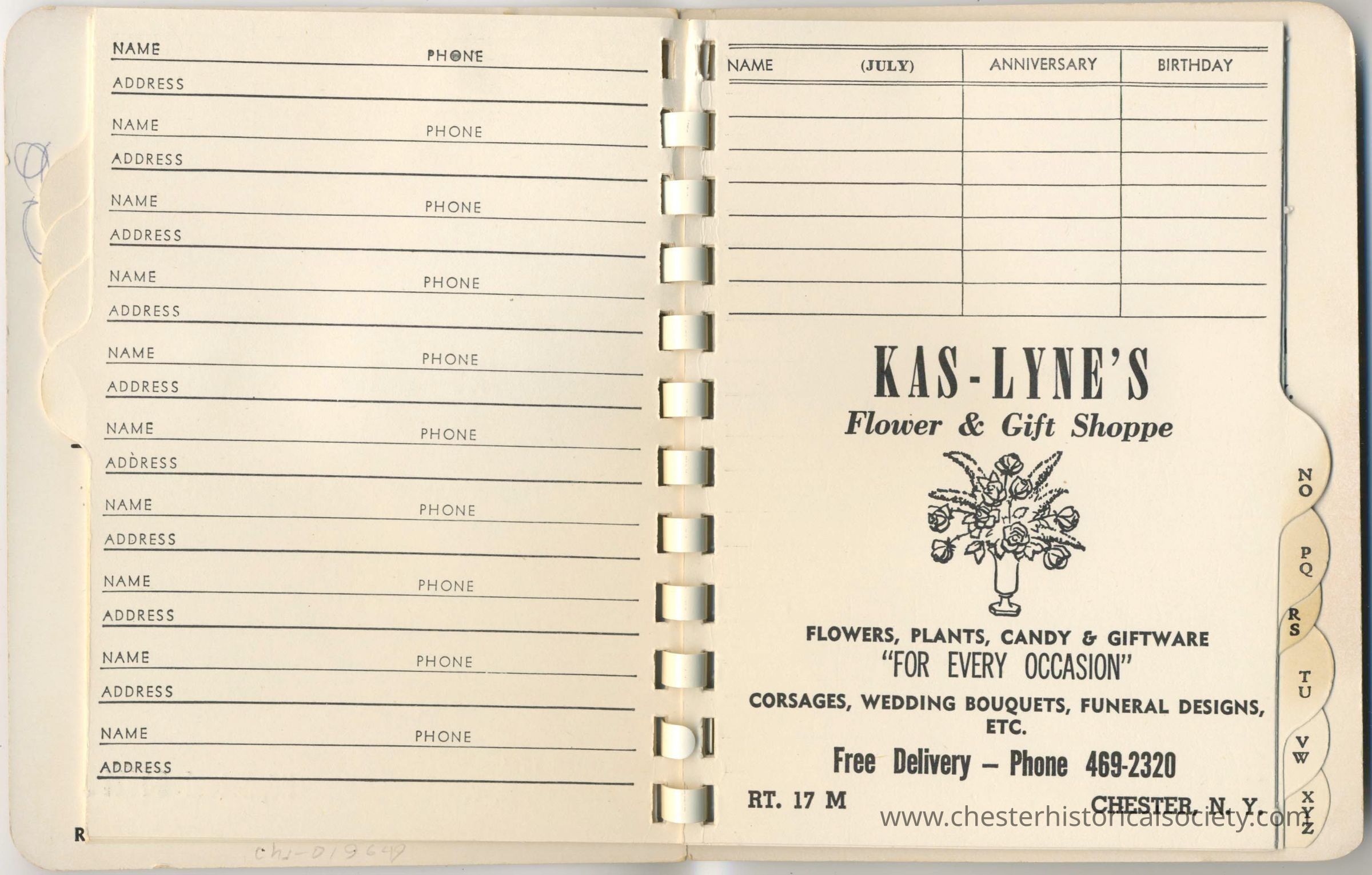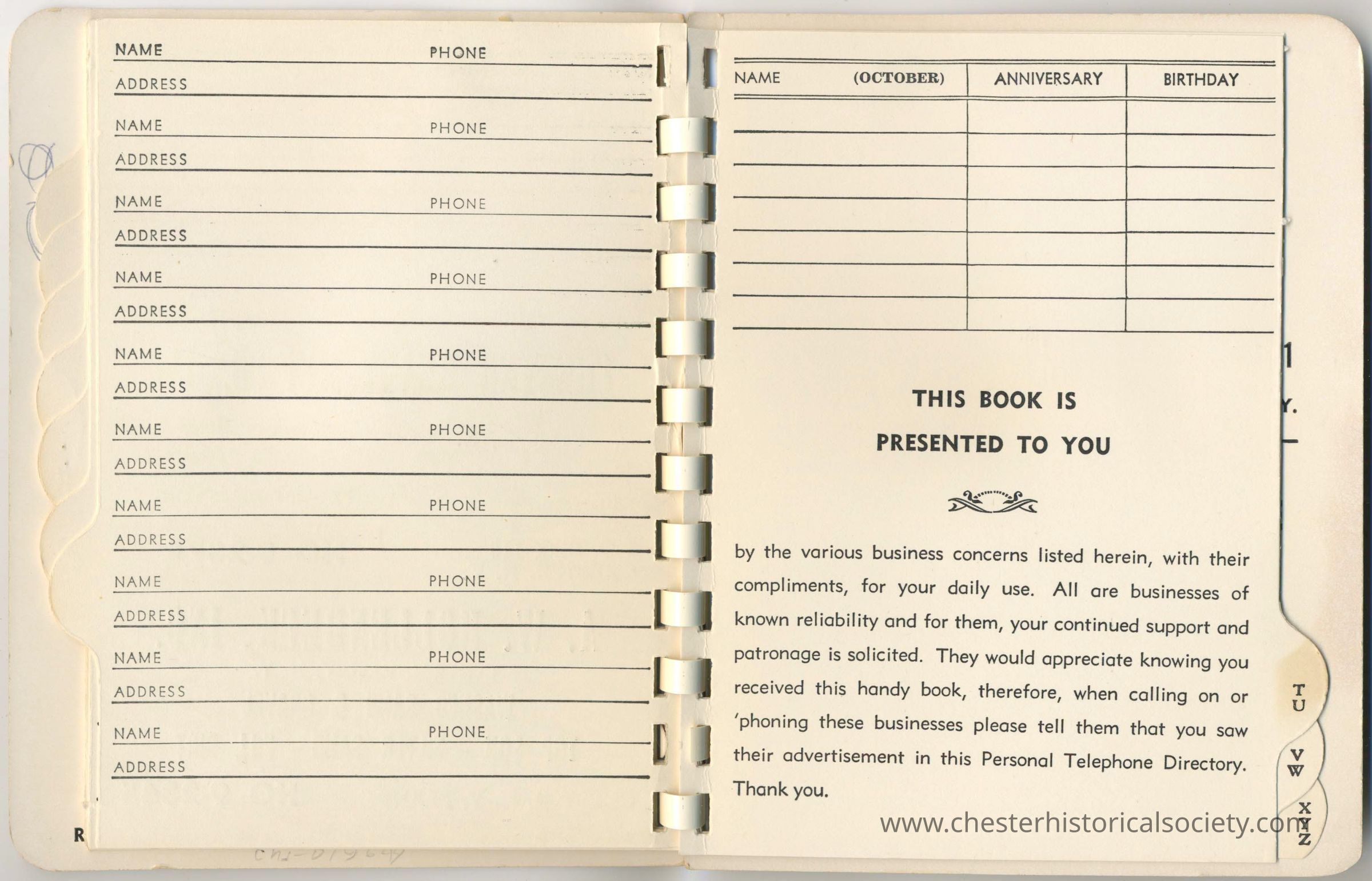 Personal Directory Anniversary Birthday - Telephone The Chester National Bank Established 1845 Small Enough To Know You Large Enough To Serve You Main Street Chester, N. Y. HO 9-2166 HO 9-2167 ––––•–––– Regular Checking Accounts Special Checking Accounts Savings Accounts Commercial Loans Mortgage Loans Banking by Mail Safe Deposit Boxes Christmas Club Member Federal Deposit Insurance Corporation [page 2] Chester Valley, Inc. Flying "A." Fuel Oil Distributors For Tide Water Oil Company Firestone Tire And Rubber Company Chester, New York HOmstead 9-2112 Night and Sundays - HOmstead 9-2531 –––––––––––––––––––- Harlo J. Fiske Agency Howell Taylor Licensed Real Estate Broker Farms • Homes • Acreages HO 9-2340 Route 17M (Just East of Academy Ave.) Chester, N. Y. [page 3] The Chester Fire District Signal Code Box Numbers Special Numbers 31 Telephone Office 1 Broken Circuit 32 Meadow Avenue 2 Recall 34 Greycourt Square 222 Chief's Call 41 High St. & Hambletonian Av. 42 St. Columba's School 43 High School 3 Noon 44 Corporation Square 51 Durland's Square 3 Before 8 A. M. No School 54 East Chester 55 West Chester 33 Water Shut Off District Numbers 11 Walton Lake Road to Kozy Korners (Head of Walton Lake) 111 Walton Lake Road Right to Geer Rd. Frank Green Farm 112 Walton Lake Road Left to Valley Rd. at Harry Davis or Jones 113 Walton Lake Road Right to Rumsey Rd. at Tom Nozkowski 114 Walton Lake Road Left to Bulls Mills - Oxford Rd. at C. I. Bull 115 Walton Lake Road Right to K. of C. Camp Rd. past Ben Smith pl. 12 Sugar Loaf Road to Warwick line, All Sugar Loaf Village 121 Sugar Loaf Road Right to Black Meadow Rd. 122 Sugar Loaf Road Left to Well Sweep Lane, at Geo. Holbert's 123 Sugar Loaf Road Right to Glenmere Rd. 124 Sugar Loaf Road Left to Bellvale Rd., Rumsey & Stevens Rds. 12S Sugar Loaf Road Right to Ridge Rd. No. 1 13 Goshen Road R 17 to Otterkill R. R. Bridge 131 Florida Road to Florida Fire District Line (Puzon Place) 132 Florida Road Right to Conklin Town Road 133 Florida Road Left to Powers Rd. 14 Washingtonville Road to Craigville Village, to Cartia Place 141 Washingtonville Road Left to Johnson Rd. 142 Washingtonville Road Left at Craigville Bridge 143 Washingtonville Road Right at Conklin Lane or Thompson's Inn for Oxford Road 23 Monroe-Oxford Road Rl 7 to Ralph Durland's Gravel Bank 231 Monroe-Oxford Road R17 Left to Quinn Rd., Camp LaGuardia, Oxford School, Joe Pickara. Carl Nigl 232 Monroe-Oxford Road R 17 Right to Lipsey Rd. 233 Monroe-Oxford Road R 17 Left at 999, all Oxford Village 24 Monroe-Oxford Road R 17 Right at Ralph Durland's to Oxford-Bull Mills Rd. 241 Monroe-Oxford Road R17 Right to Valley Rd. at Tom Roe's [page 4] Your Guide To Better Shopping Originated By Bankers' Ad Service of N. J. ––––––––––––––– Auto Repairs - Body Shop - U-Hall Trailer Rentals (See Inside Back Cover) Chester B & J Garage HO 9-2321 Builders - Mason Contractors (See Inside Back Cover) Joseph Long & Son HO 9-4451 - 4261 Carpenter - Builder (See C-D) Bernard G. Hom HO 9-4170 Department Store (See A-B) Clem and Daisy's Department Store HO 9-2361 Driveways - Parking Areas (See G-H) Ray Gailie - Blacktopping HO 9-4074 Flower & Gift Shop (See N-O) Kas-Lyne's Flower & Gift Shoppe 469-2320 Fuel Oil - Firestone Tires (See Inside Front Cover) Chester Valley, Inc. HO 9-2112 Fuel Oil (See Outside Back Cover) George C. Hawkins & Sons, Inc. HO 9-2323 Funeral Home (See Outside Back Cover) The Conger Memorial Home HO 9-2323 Heating (See E-F) The Diamond Electric Heat & Insulation Co. HO 9-4577 Lawn Mowers Sales & Service - Snow Removal Equipment (See V-W) Mike's Small Engine Repair STory 3-4333 Monuments - Memorials (See Outside Back Cover) Chester Memorials, Inc. HO 9-2561 Plumbing And Heating (See P-Q) W. J. Green HO 9-2341 Ready-Mix Concrete (See R-S) Chester Ready-Mix Co., Inc. HO 9-2375 Real Estate (See Inside Front Cover) Harlo J. Fiske Agency (Howell Taylor) HO 9-2340 Restaurant - Fountain Service (See I-J-K) Gallo's Cozy Corner HO 9-7551 Service Station (See L-M) Midway Service Station HO 9-7821 Septic Tanks - Sewer Builders (See X-Y-Z) John P. Hilgers, Inc. HO 9-2501 Washed Sand & Gravel -Top Soil - Flll Dirt (See R-S) A. W. Hollenheck, Inc. HO 9-2345 ––––––––––––– Published by Ray L. De Vinney, Inc. - Bergenfield, N. J. Printed By De Vinney Press, Inc. Englewood, N. J, [page 5] Name (March) | Anniversary | Birthday –––––––––––––– It's Safe - Clean - Quiet - Comfortable! Electric Comfort Heating * Room By Room Control * Complete Control of Comfort & Cost * Greater Year Round Comfort GE Installed Under Rigid Requirement. The Diamond Electric Heat 6 Insulation Co. Free Estimates Frank Fichter Call HO 9-4577 Kings Highway Sugar Loaf, N. Y. [page 6] Name Phone Address [page 7] Name (April) | Anniversary | Birthday –––––––––––––– Ray Gailie Blacktopping HO 9-4074 Asphalt Paving • Drives • Walks • Parking Areas Laroe Road Chester, N. Y. [page 8] Name Phone Address [page 9] Name (May) | Anniversary | Birthday –––––––––––––– "Find Food and a Friendly Atmosphere" Gallo's Cozy Corner Vince & Margo Gallo Luncheon - Dinner - Breakfast Served Stop In and Enjoy Our Hero Sandwiches Fountain Service - Ice Cream - Soda Open 6 A.M. 'Til Midnight 7 Days A Week Cor. Rts. 94 & 17 M Chester, N. Y. HO 9-7551 [page 10] Name Phone Address [page 11] Name (June) | Anniversary | Birthday –––––––––––––– Midway Service Station Tydol- Veedol Lubrication - Accessories Flying A Service Route 17M Chester, N. Y. HOmestead 9-7821 [page 12] Name Phone Address [page 13] Name (July) | Anniversary | Birthday –––––––––––––– KAS-LYNE'S Flower & Gift Shoppe FLOWERS, PLANTS, CANDY & GIFTWARE "FOR EVERY OCCASION" CORSAGES, WEDDING BOUQUETS, FUNERAL DESIGNS, ETC. Free Delivery - Phone 469-