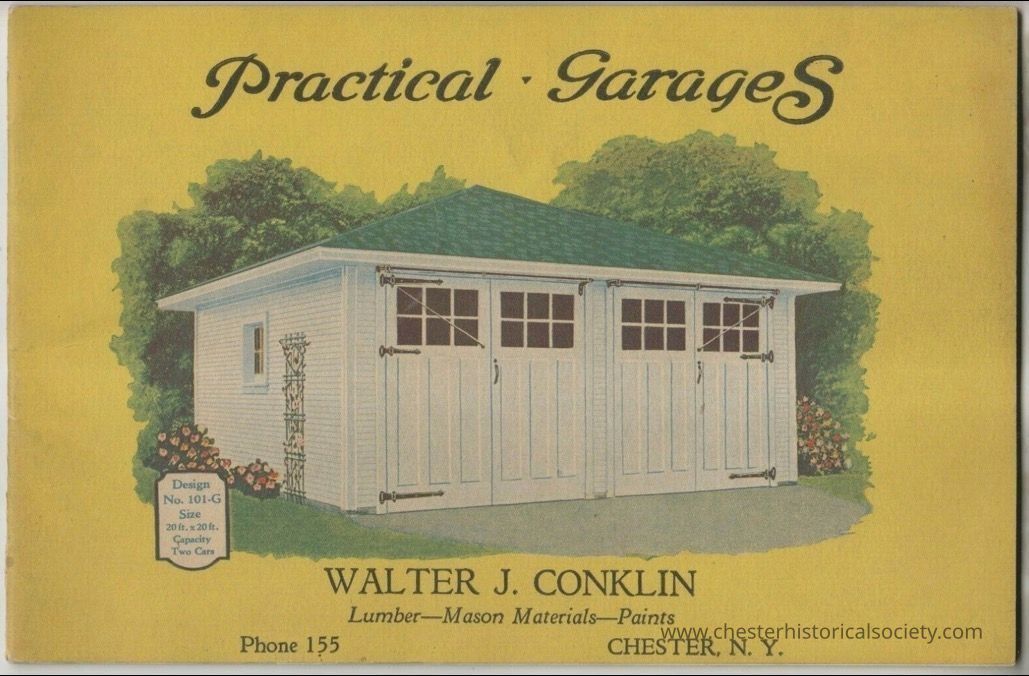 The front cover with Conklin imprint of a 32 page Practical Garages Catalog by Walter J. Conklin - Chester New York.Context