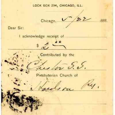 I acknowledge receipt of $2 Contributed by the Chestor S.S. Presbyterian Church of Hudson NY.