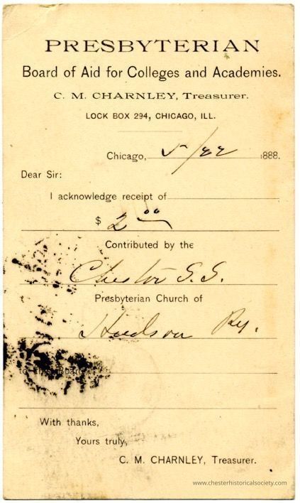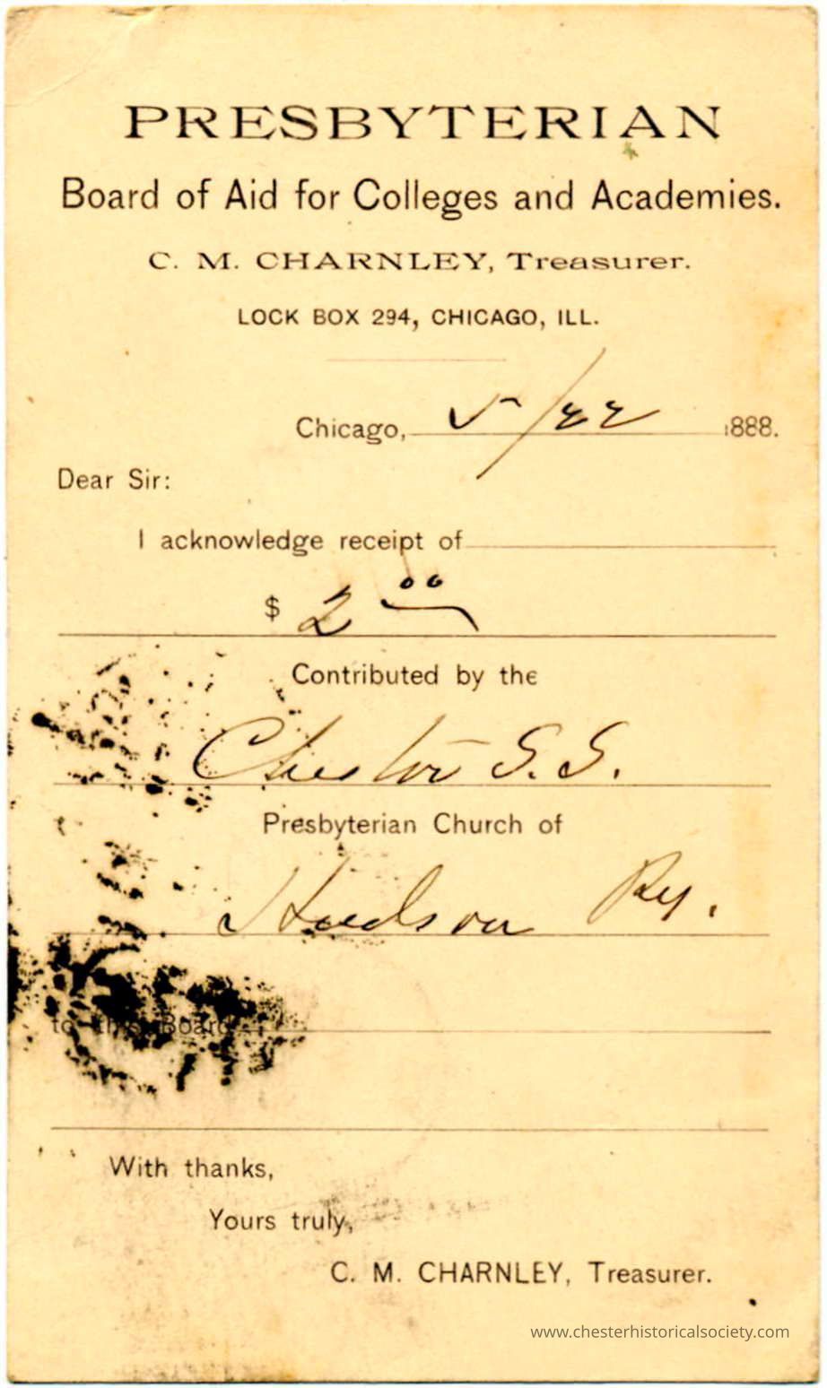 The image shows a vintage receipt from the Presbyterian Board of Aid for Colleges and Academies, dated June 2, 1888, issued in Chicago, Illinois, acknowledging the receipt of a contribution amounting to $50, contributed by the Chester Sunday School Presbyterian Church of Hudson, N.Y. presumably in a bid to support educational initiatives facilitated by the board; the receipt, signed by the treasurer C.M. Charnley, expresses gratitude for the contribution.