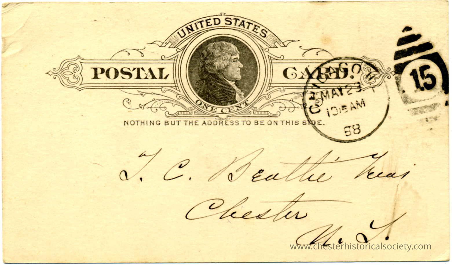 The image shows an old United States postal card, featuring a one-cent stamp with a portrait of a historical figure, likely from the late 19th century, as evidenced by the date stamp from May 21, 1888, and the ornate design framing the portrait; it is addressed in elegant handwriting to a recipient in Chester, N.Y., with an instruction printed on the card stating, "Nothing but the address to be on this side," indicating its purpose and period of use in postal history.Subject Person/Organization