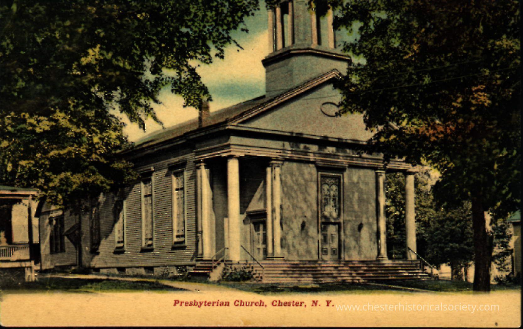 This colorized photo postcard depicts the Presbyterian Church in Chester, NY, surrounded by mature trees.Subject Person/Organization