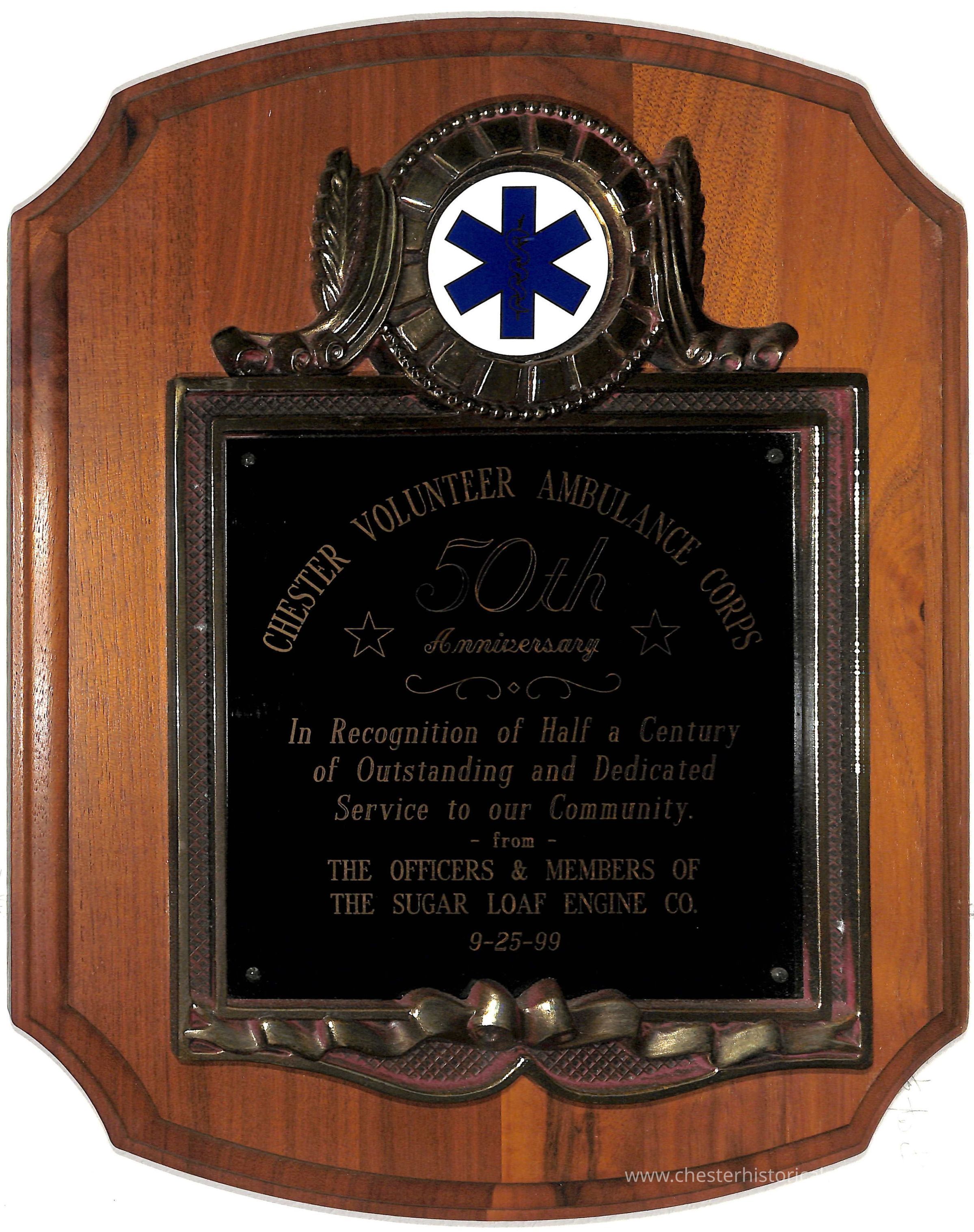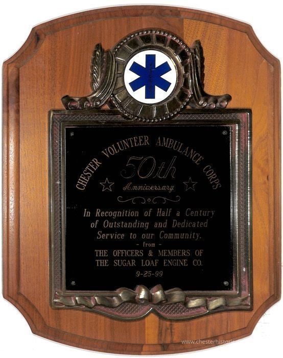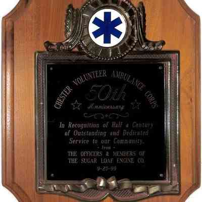 Plaque was awarded in recognition of half a century of outstanding and dedicated service to our community: Chester Volunteer Ambulance Corps from Trout Brook Engine & Hose Company.Collection