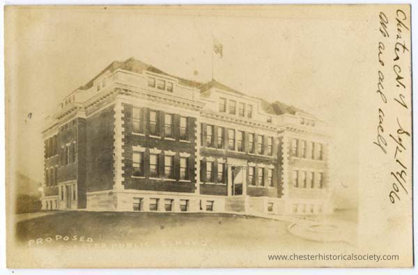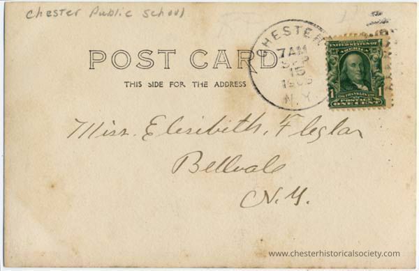 Real Photo Post Card showing Chester Public School and dated September 15, 1906. Card mailed with one cent stamp to Miss Elisibeth Fleglar at Bellvale, New York. Card has some silvery highlights on front.Create Date