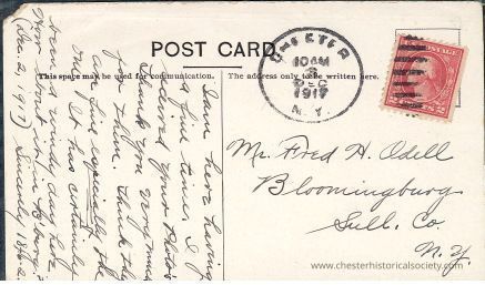 The other side of this postcard with handwritten script covering most of the left side, flipping the traditional layout as the space usually reserved for correspondence is filled with text and the address side contains only a small section for writing. The postcard is stamped with a red one-cent George Washington stamp, which is canceled with a postmark dated December 2, 1917, from Cheser, NY. The card is addressed to Mr. Fred H, Odell in Bloomingburg, Sullivan County, New York.Subject Person/Organization