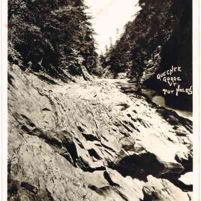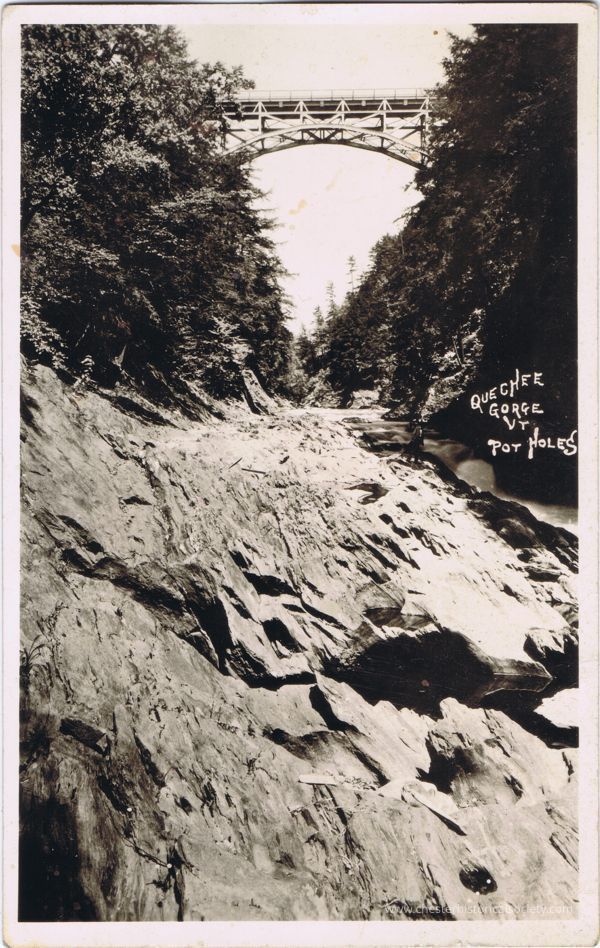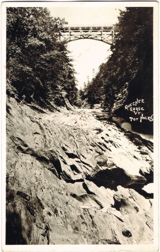 The monochrome photo postcard captures a rugged, rocky gorge known as Quechee Gorge in Vermont, characterized by its steep and textured rock formations. In the background, a metal bridge arches gracefully over the gorge surrounded by dense forests. The gorge is highlighted by the presence of natural potholes in its rocky bed, hinting at the powerful natural forces that have shaped this landscape over time. The scene suggests a tranquil yet untouched piece of nature, preserved in the heart of Vermont, offering a glimpse into geological phenomena.