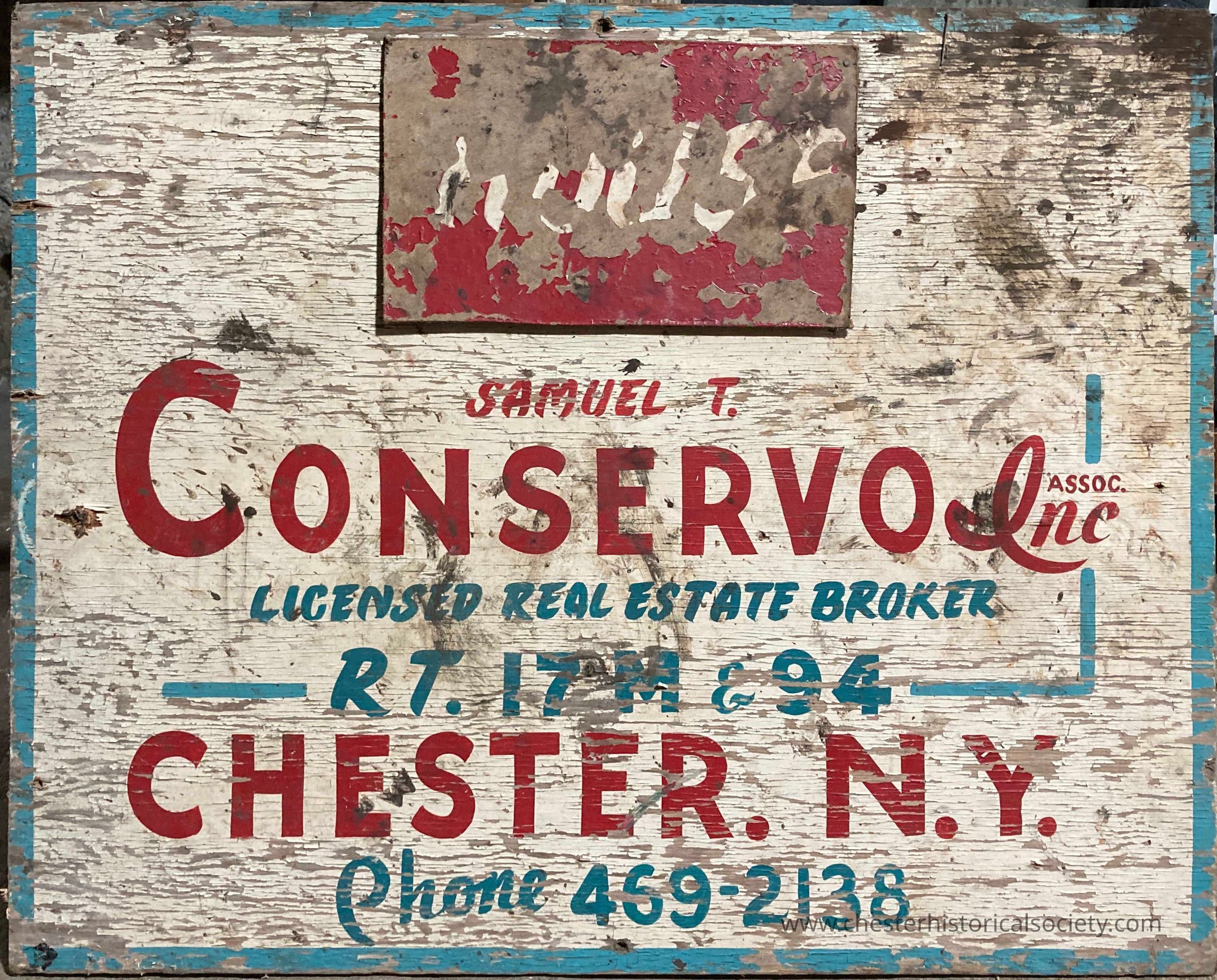 Samuel T. Conservo Licensed Real Estate Broker sign, apparently last used to advertise a house.Context