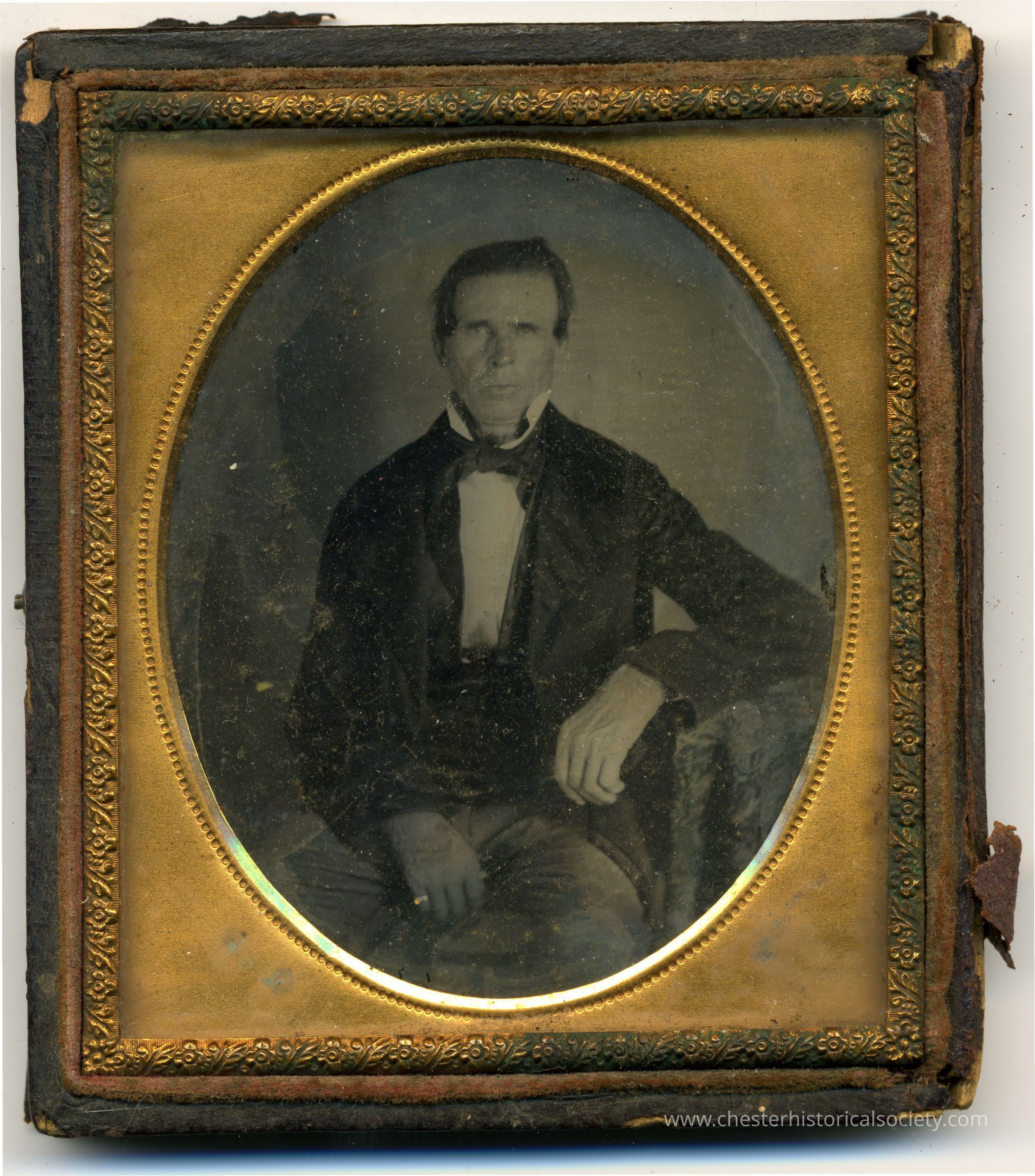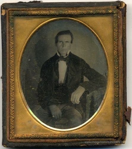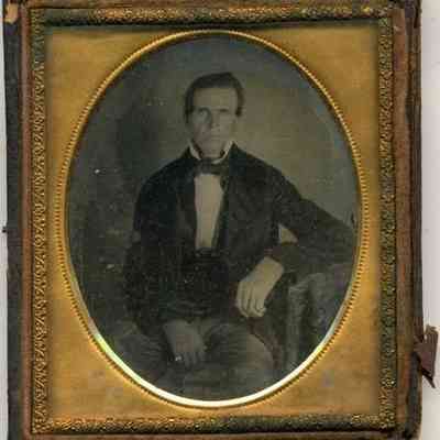 The image presents an early photographic portrait contained within a decorative, oval brass mat and a deteriorating leather case. The photo depicts a seated man wearing dark, formal 19th-century attire, including a jacket and a bow tie, with a solemn expression. His right hand gently rested on his thigh, and his gaze seems directed straight at the viewer, conveying a sense of thoughtful composure.