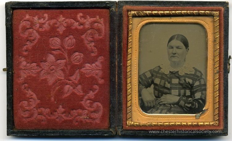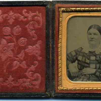 This image shows an antique photograph housed in a hinged, dual-sided case: one side displays a plush red fabric with a floral pattern, and the other side reveals a daguerreotype portrait of an elderly woman wearing a dark checkered dress adorned with a lace collar, her hands gently resting in her lap, framed by an ornate gold border.