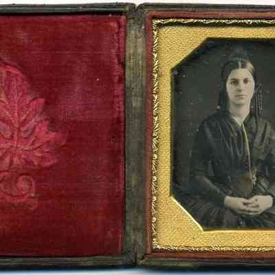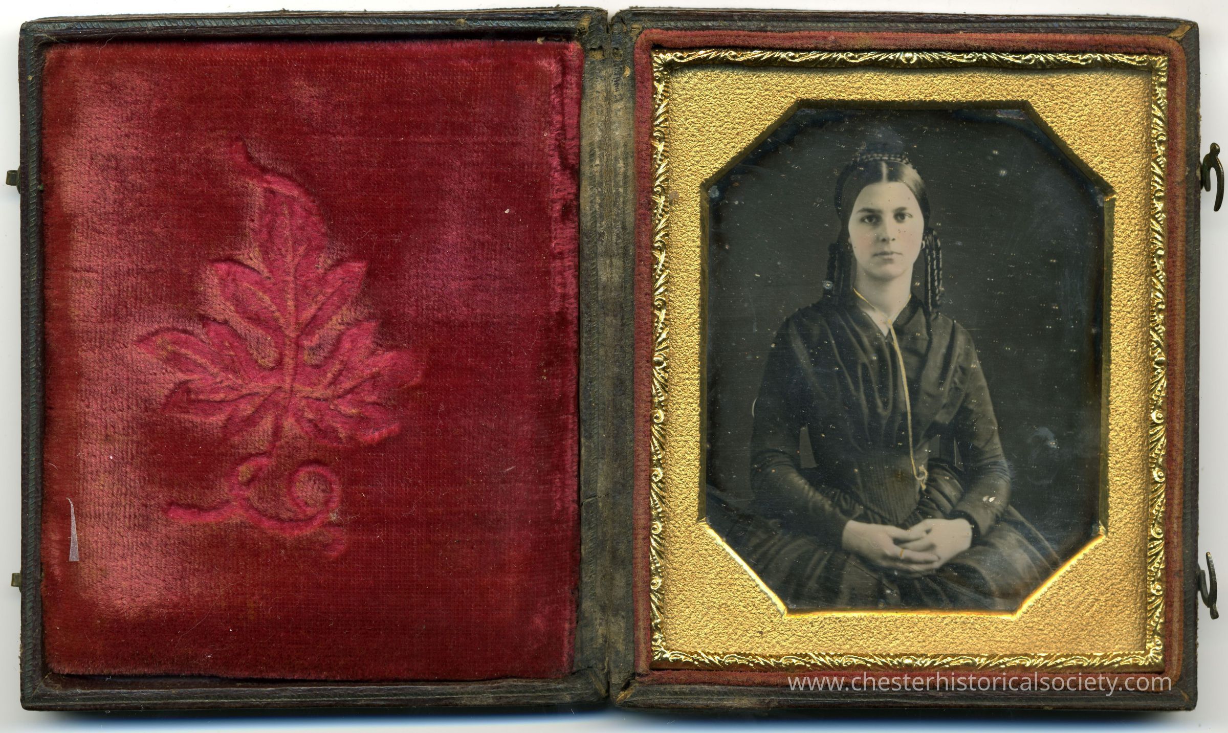 The image features an antique daguerreotype photograph of a young woman, visibly displayed within a faded red case with a decorative golden leaf motif embossed on the left side. The woman, dressed in a dark mid-19th century attire, has her hair neatly parted and braided, with a solemn expression on her face, positioned against a plain dark backdrop, framed by a detailed golden ornate border.