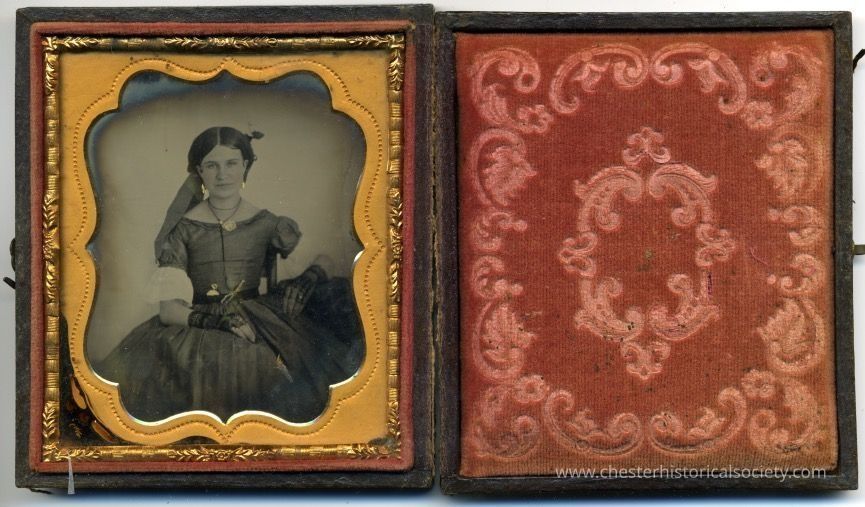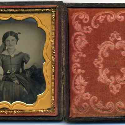 The image displays an old, faded daguerreotype of a woman wearing a Victorian era dress, styled with a tightly fitted bodice and voluminous skirt, accessorized with a dark ribbon around her neck and matching bracelets on each wrist. She is framed within a decorative gold inner frame, showcasing intricate patterns, encased in a weathered red outer case adorned with a textured floral design. Her expression is poised and serene, typical of portraiture from this period.