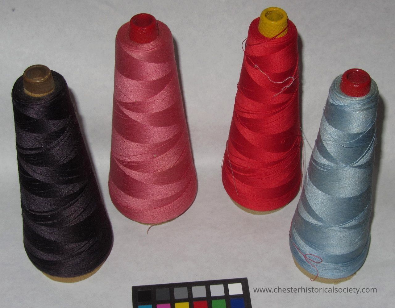 The American Thread spools; one each: 6985 Mightnight, V2003 Scarlet, V.2082 May Rose, and V.6182 Wireless; were from the Chester Manufacturing Company. When they began, they made children's coats under the name of Franette Sportswear. Later, they made children's outfits.