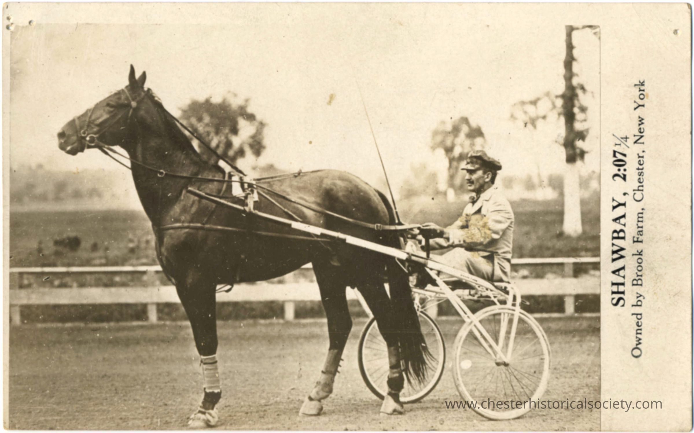 Photo postcard of Trotter, Shawbay, with driver in racing colors proclaiming run of 2:07 1/4! A year late Shawbay would improve that time by two seconds! Shawbay was got by Silent Brook, 2 :16 1/2; Dam Mary Mapes (dam of five, including May Stewart, 2 :15 1/4, she the dam of Junior Watts, 2 :09 3/4. and Rose Watts, 2 :10), by Wilton, 2:19 1/4; second dam, Nora Mapes (dam of Searchlight, 2:03 1/4 etc.), by Furor, Son of King Rene, by Belmont 64. Owned by Brook