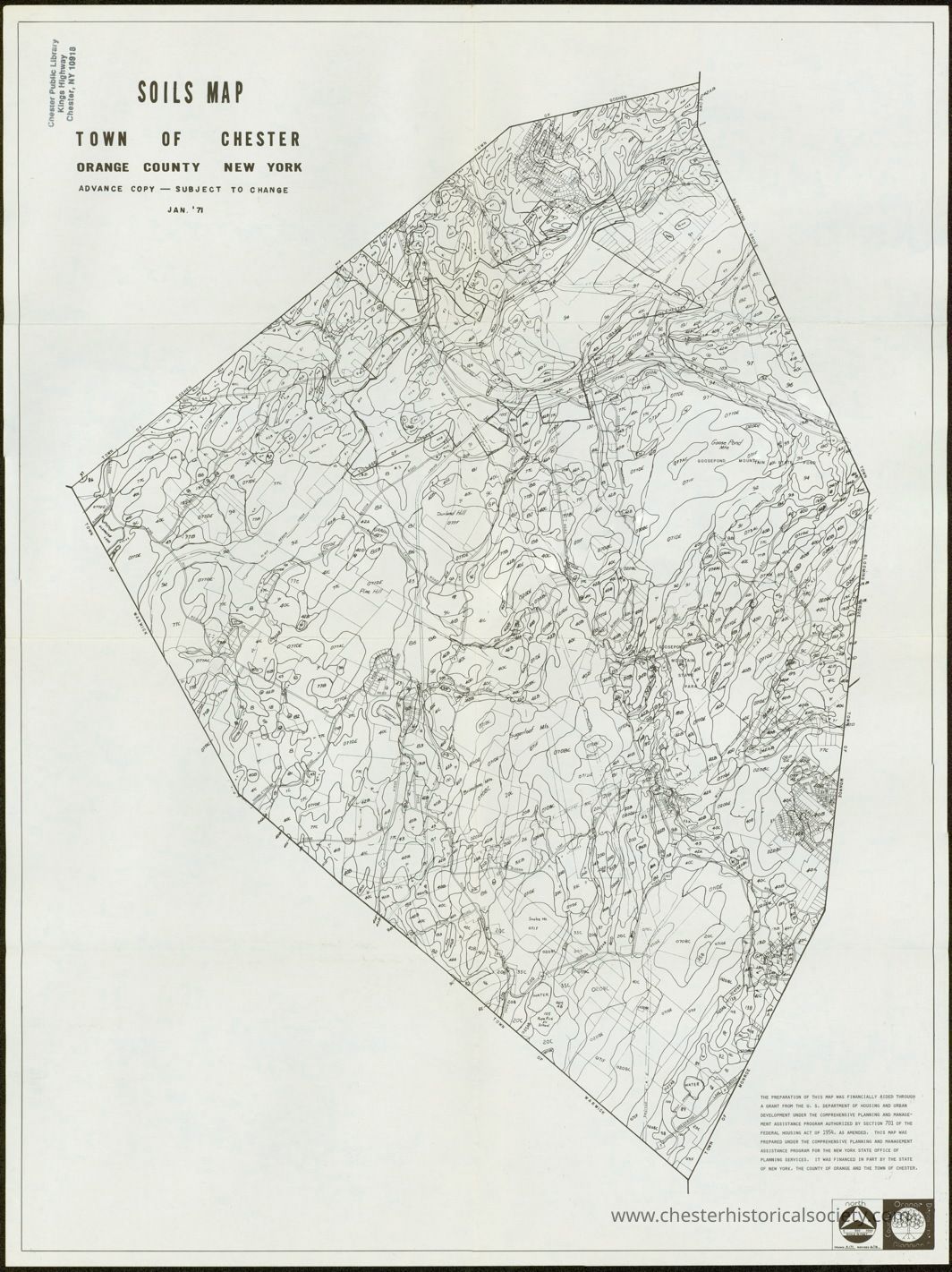 The preparation of this map was financially aided through a grant from the U. S. Department of Housing and Urban Development under the comprehensive planning and management assistance program authorized by Section 701 of the Federal Housing Act of 1954, as amended. This map was prepared under the comprehensive planning and management assistance program for the New York State Office Of Planning Services. It was financed in part by the State of New York, the County of Orange and the Town of Chester.
