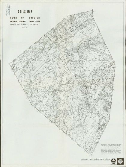 The image is a detailed soil map of the Town of Chester in Orange County, New York, dated January 1972, showing topographical contours, boundaries, and various soil classifications indicated by unique symbols and codes, providing comprehensive geographical information for agricultural, developmental, or environmental planning purposes, with a legend and notation in the upper and lower sections, emphasizing it as an advance copy subject to change, and including coordinates and surveyor details.Map Details